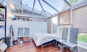 A bright additional living space with double glazed doors opening to the rear garden and a double glazed window overlooking the garden.