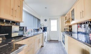 Located at the rear of the property, the kitchen features a double glazed window, double glazed side door, stainless steel sink and drainer unit, fitted wall and base units with work surfaces over, built-in oven, gas hob with stainless steel chimney hood, plumbing for dishwasher and washing machine, and a radiator.