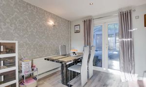 A generous through lounge diner with a double glazed window to the front elevation, inset ceiling spotlights and laminate flooring. This room includes stairs to the first floor, a storage cupboard and two radiators.