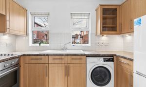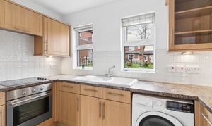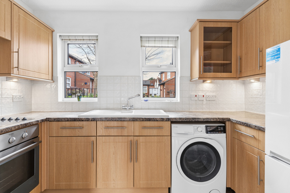 The light and spacious accommodation includes a generous living room that opens into a modern fitted kitchen. The kitchen overlooks the communal garden and is fitted with a range of eye and base level units, along with integrated appliances including an oven and hob, washer/dryer, and fridge freezer. The property further benefits from a good-sized double bedroom with a built-in wardrobe and a contemporary tiled shower room. There is also a useful airing cupboard providing additional storage.