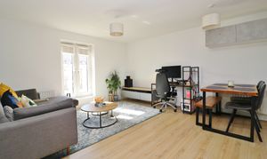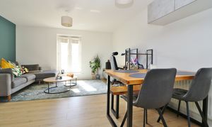 The well-proportioned lounge/diner has a Juliet balcony to the front and is open plan to the modern kitchen, which has a window to the rear and is fitted with a range of wall and base units, with a built-in oven and gas hob with extractor over, as well as an integrated fridge/freezer and a washer/dryer.