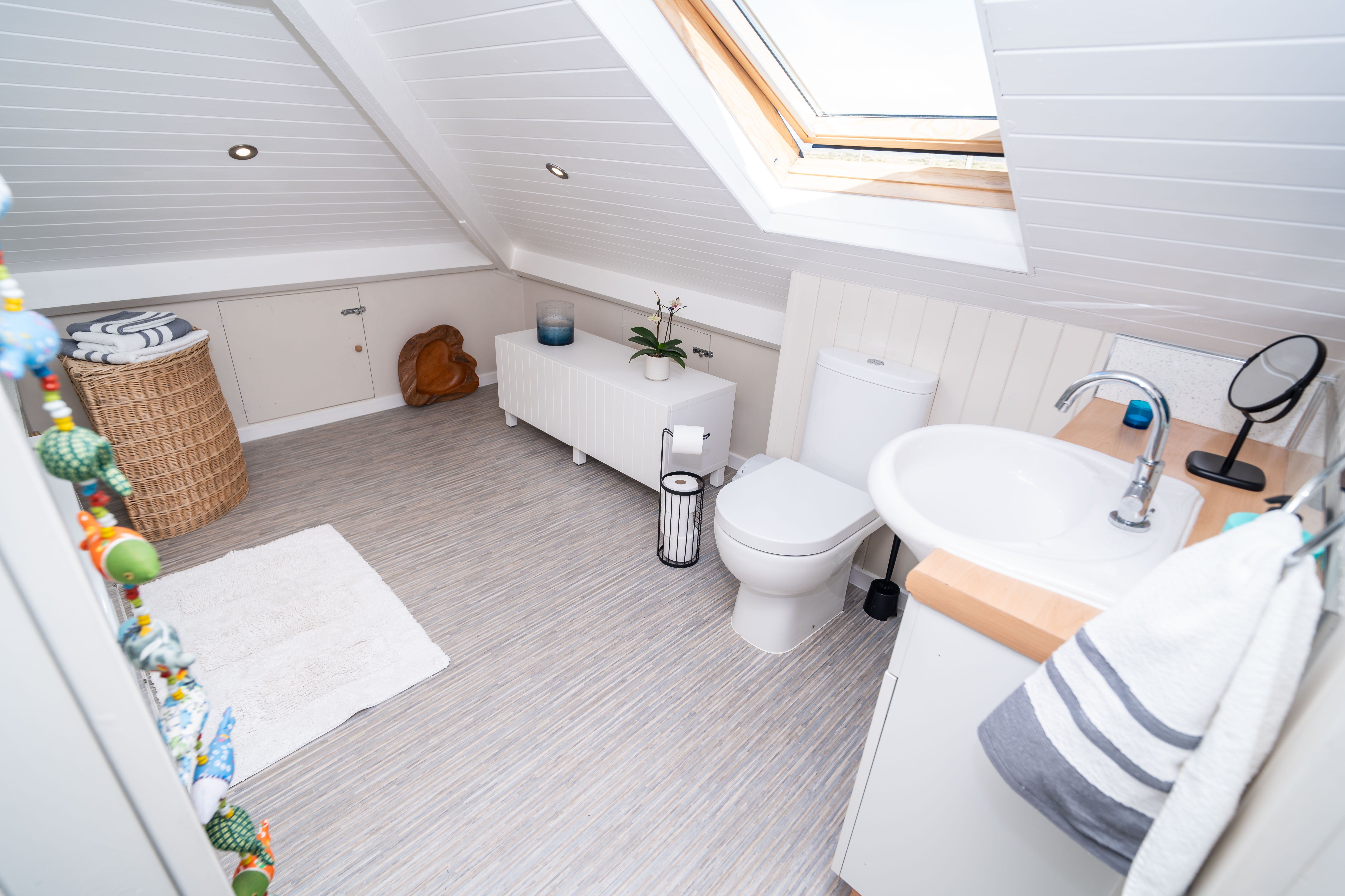 Styled with a nautical theme, this bathroom includes a panel-enclosed bath, low-level WC, and vanity wash hand basin. Additional features include part-tiled and part-panelled walls, a painted wood-panelled ceiling, useful eaves storage, and a Velux window framing countryside views to the rear of Borth.
