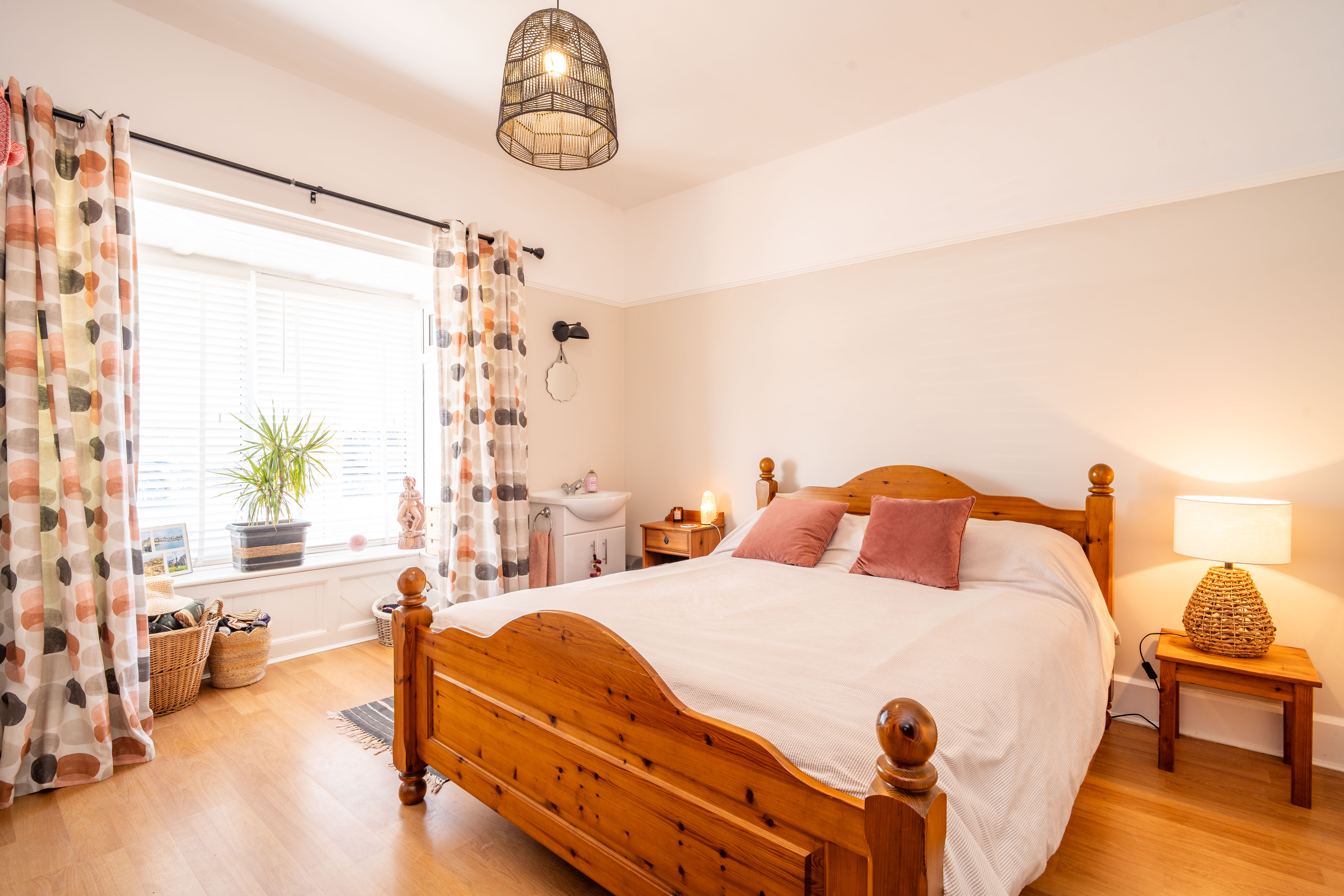 Steps lead down to a further double bedroom with side aspect, laminate flooring, radiator, fitted storage cupboard, and a vanity wash hand basin.