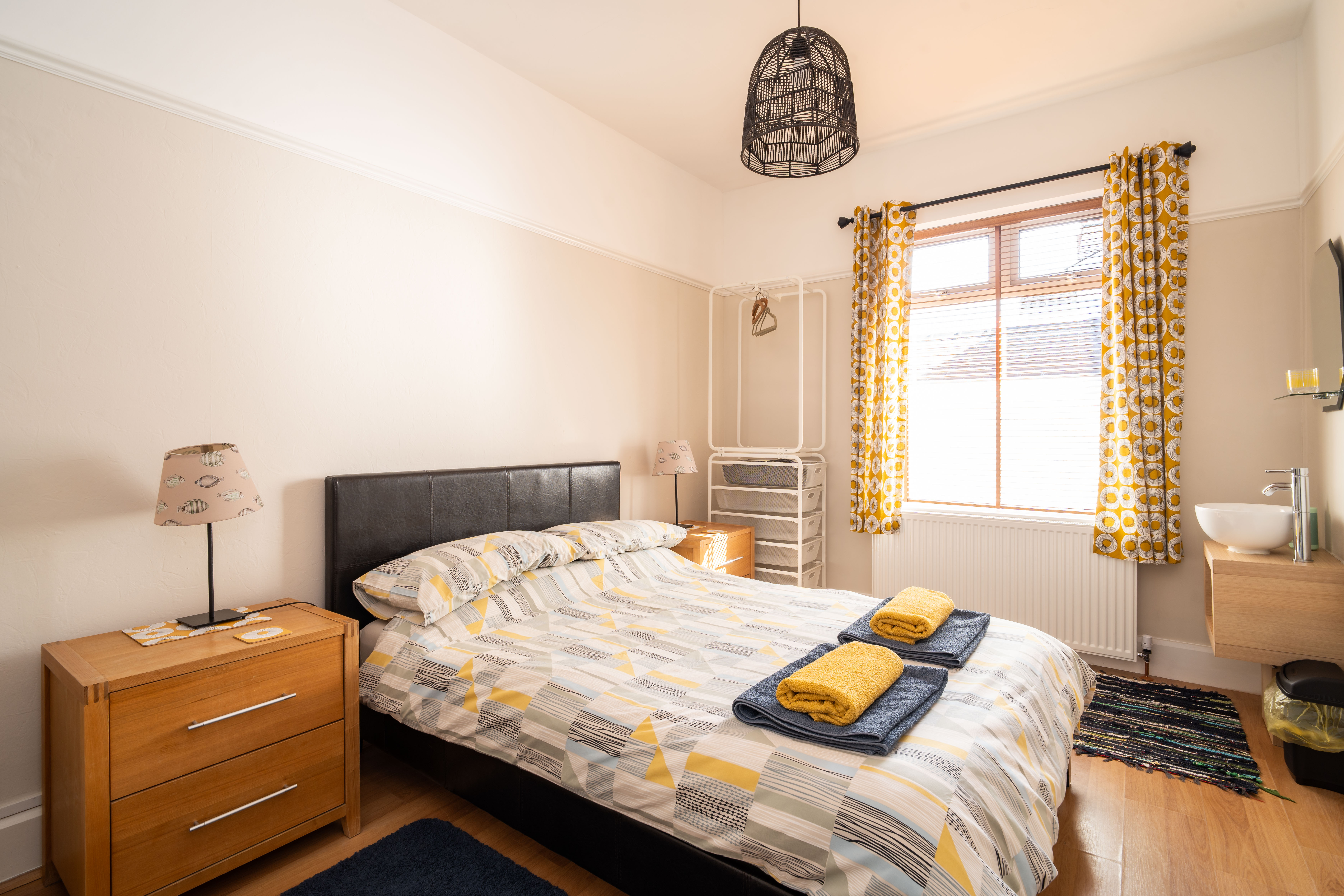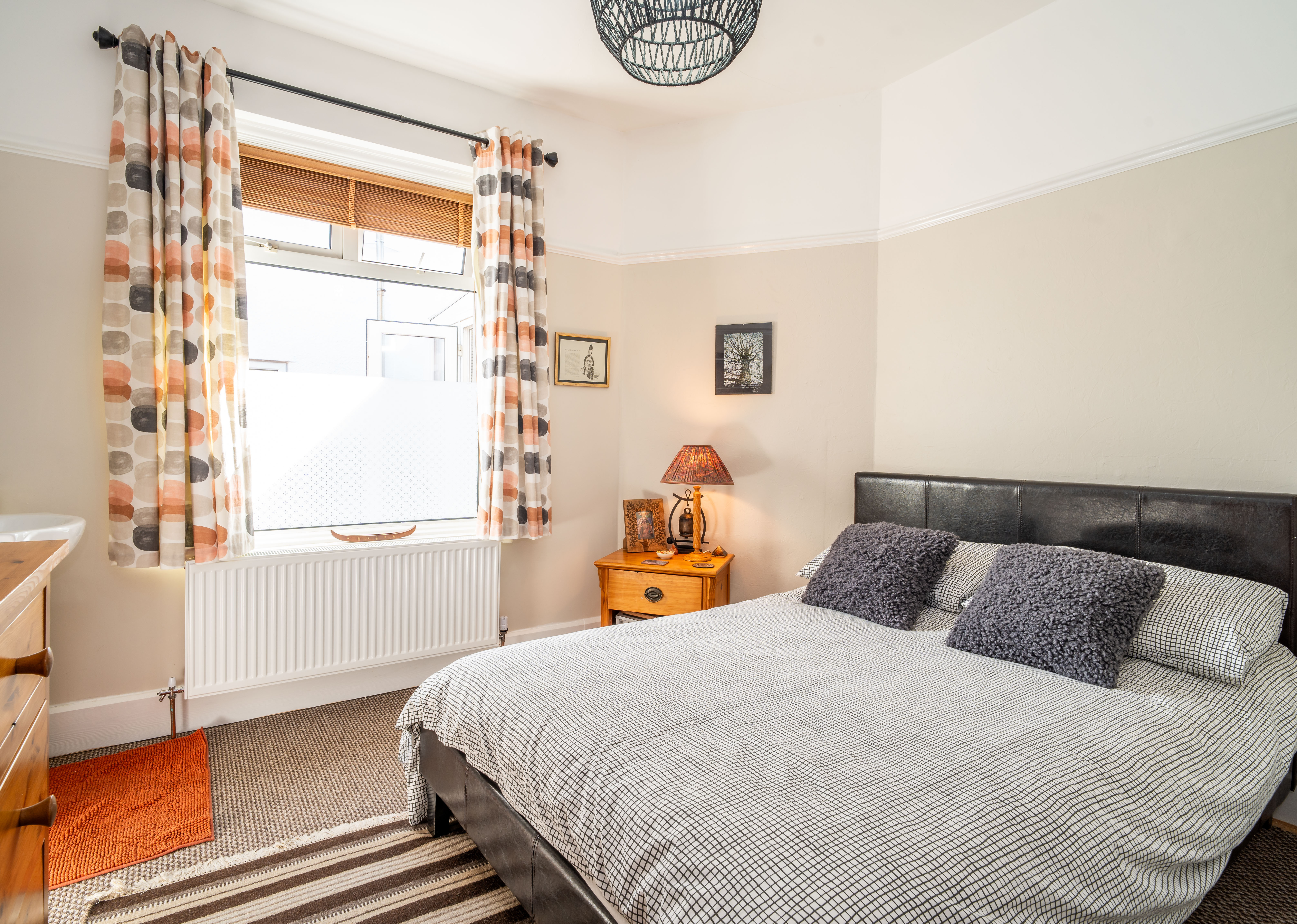 Another well-proportioned double bedroom, this time side-facing, with a double-glazed window, radiator, picture rail, and a fitted vanity wash hand basin.