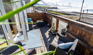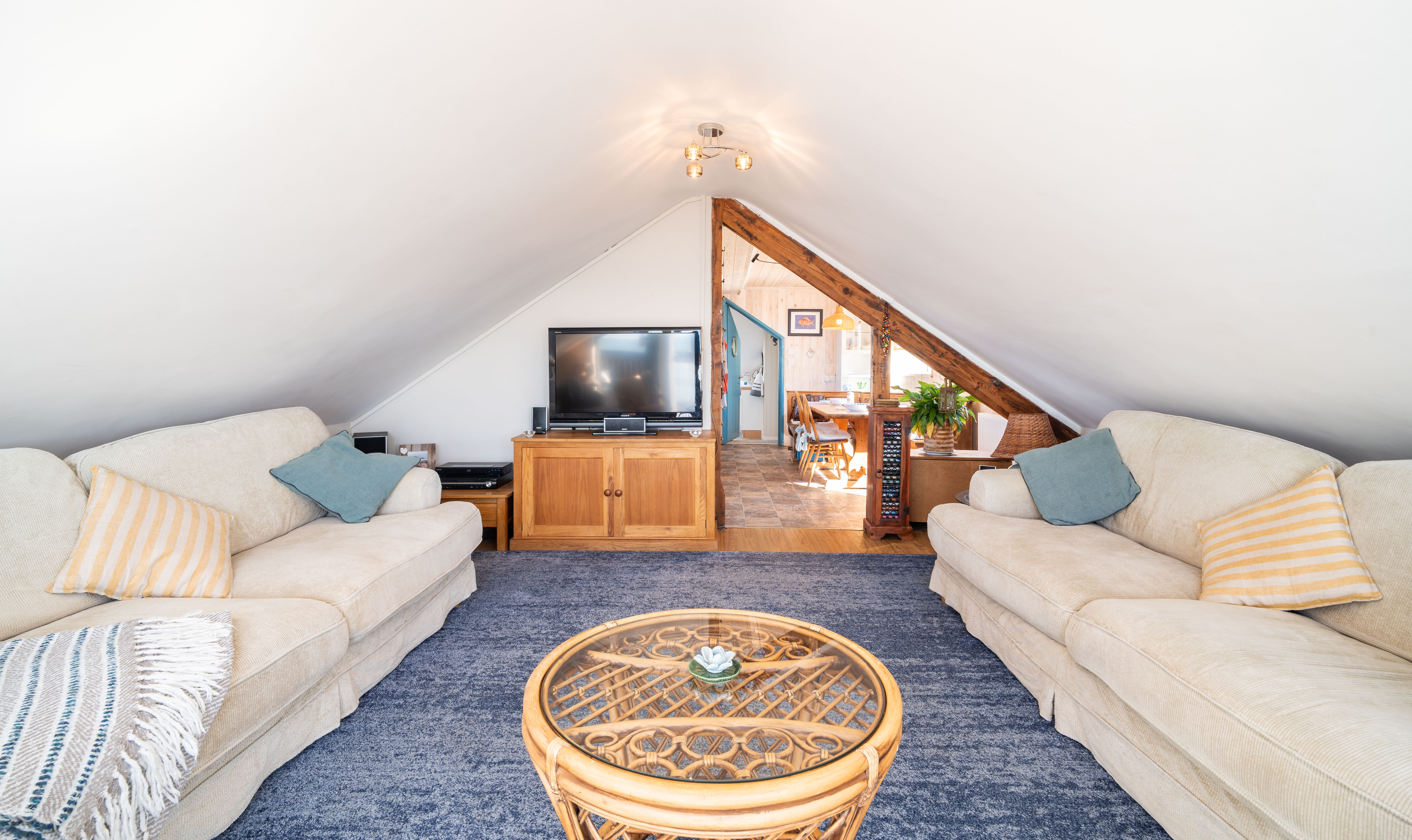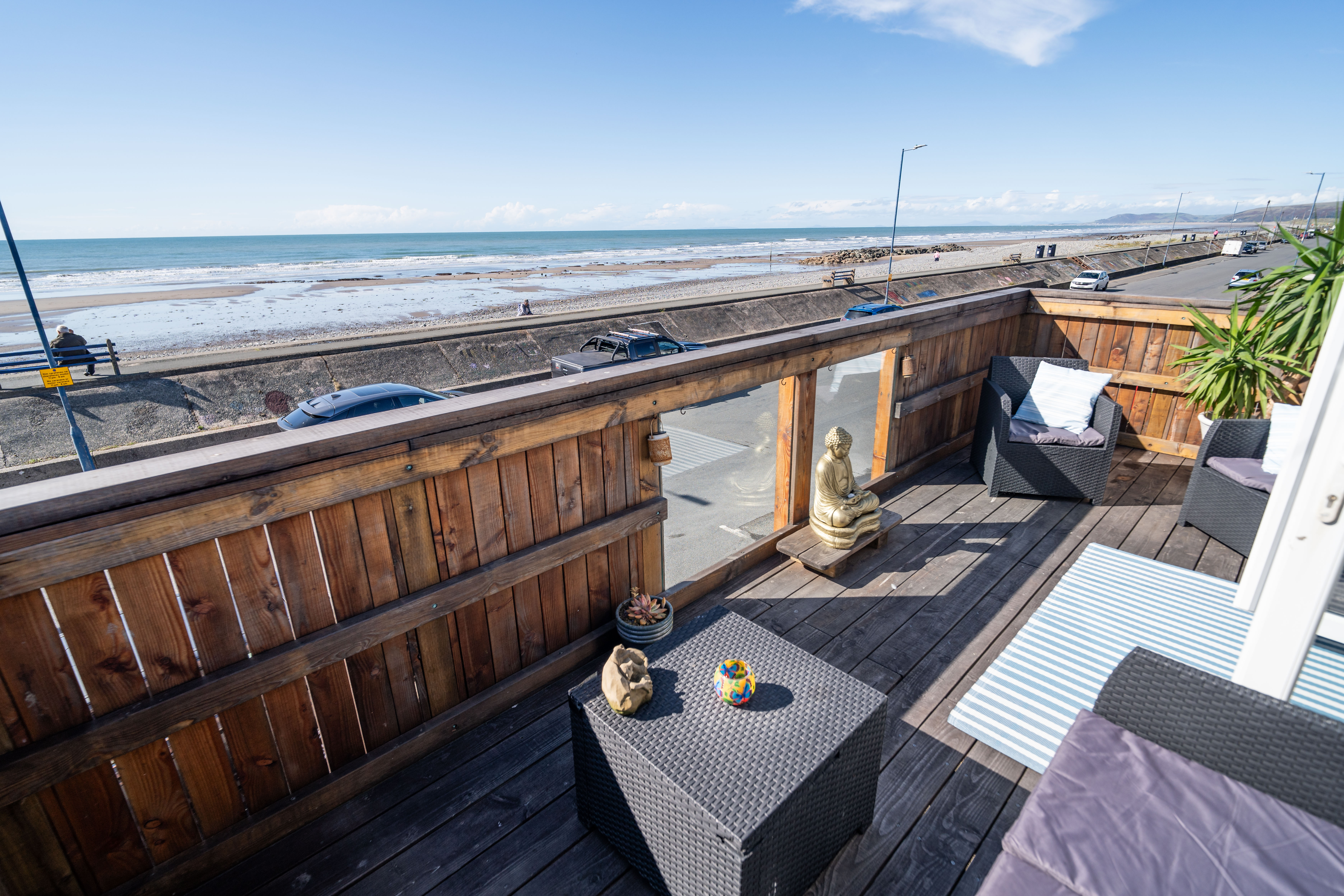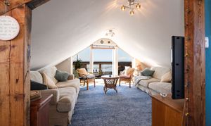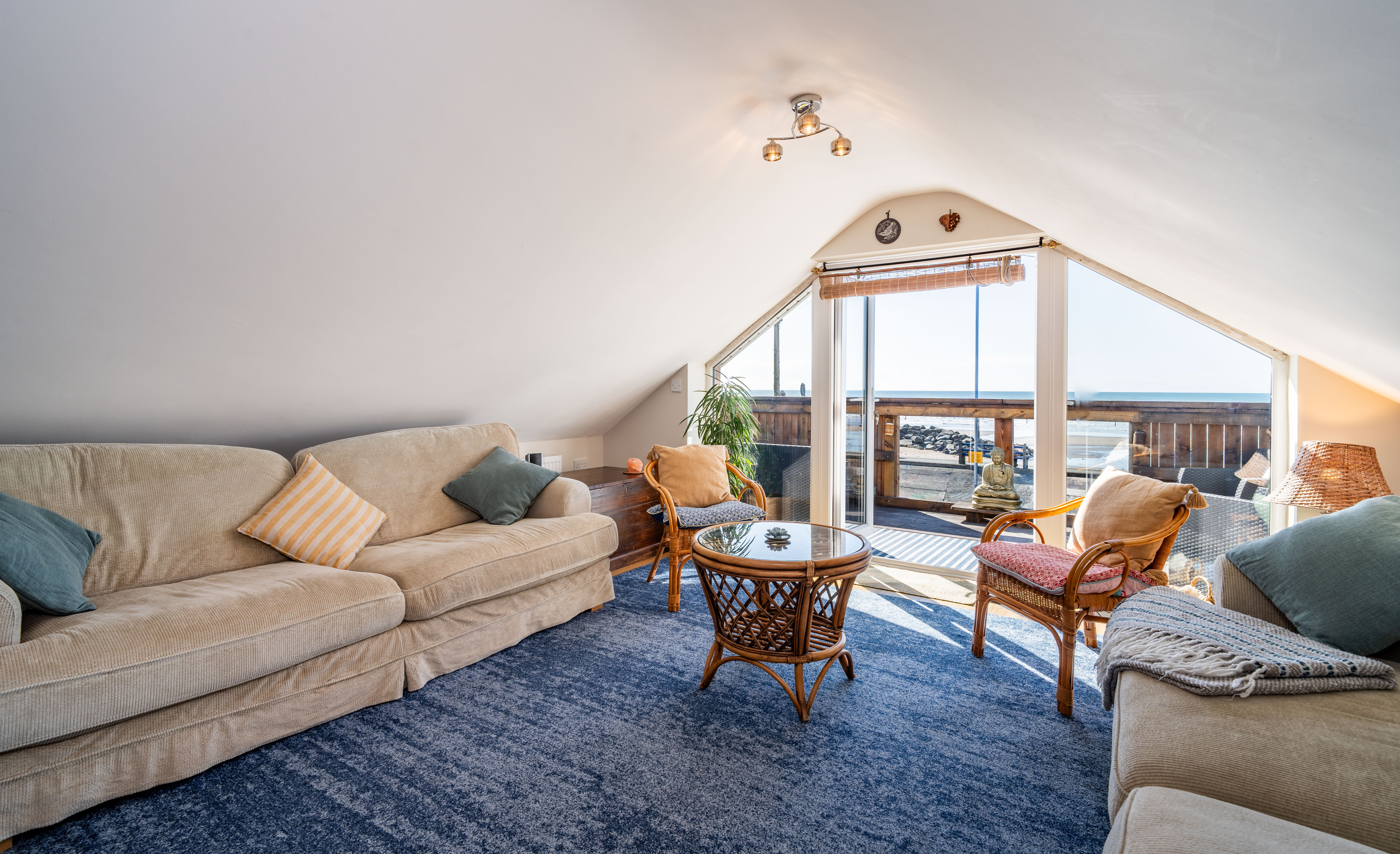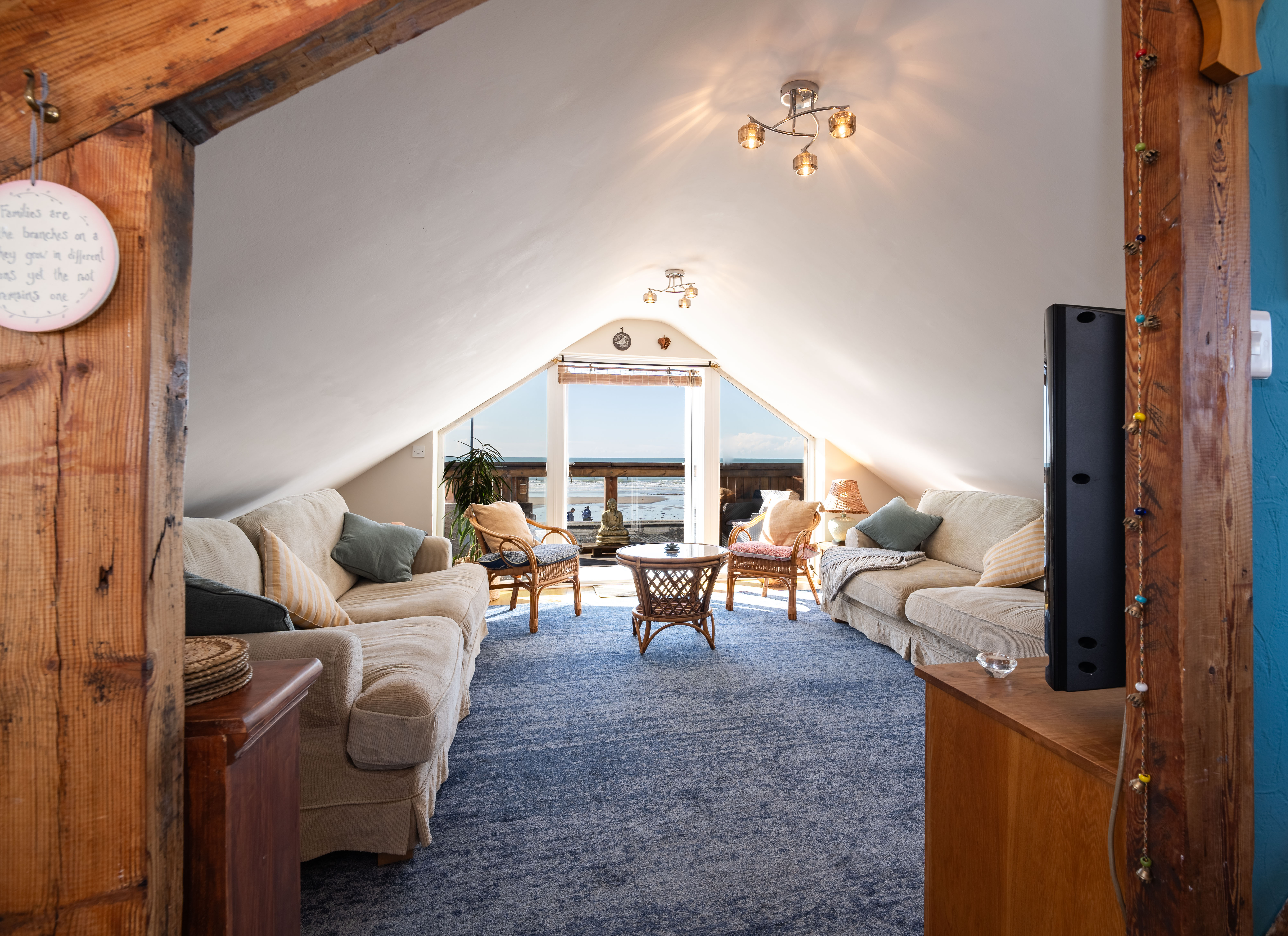 Flowing from the kitchen/dining area, this expansive reception room enjoys sloping ceilings and wide glazing that opens onto the balcony, where uninterrupted views over Borth Beach and Cardigan Bay create a spectacular backdrop. Ideal for relaxing or entertaining, this is a true highlight of the property.