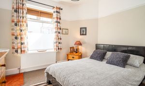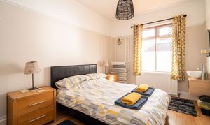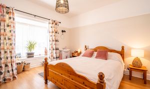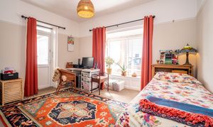 A spacious front-aspect double bedroom with a walk-in bay window that frames views of the High Street and allows light to pour in. Fitted with a vanity wash hand basin, picture rail detailing, a radiator, and laminate flooring, it offers a comfortable and bright sleeping space.