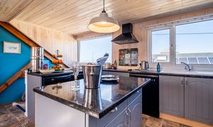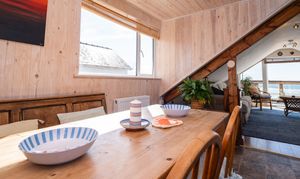 A fantastic open-plan kitchen and dining area, designed to capture the dramatic views over Borth and the sea. The kitchen is fitted with a comprehensive range of eye- and base-level units, including a Neff double built-in electric oven, a four-ring Hotpoint ceramic hob with extractor, and space for a fridge and freezer. At its centre sits an island unit, perfect for informal dining or extra workspace. The dining area is full of light thanks to broad glazing, and features part-panelled walls and a painted wood-panelled ceiling, giving a relaxed coastal feel.