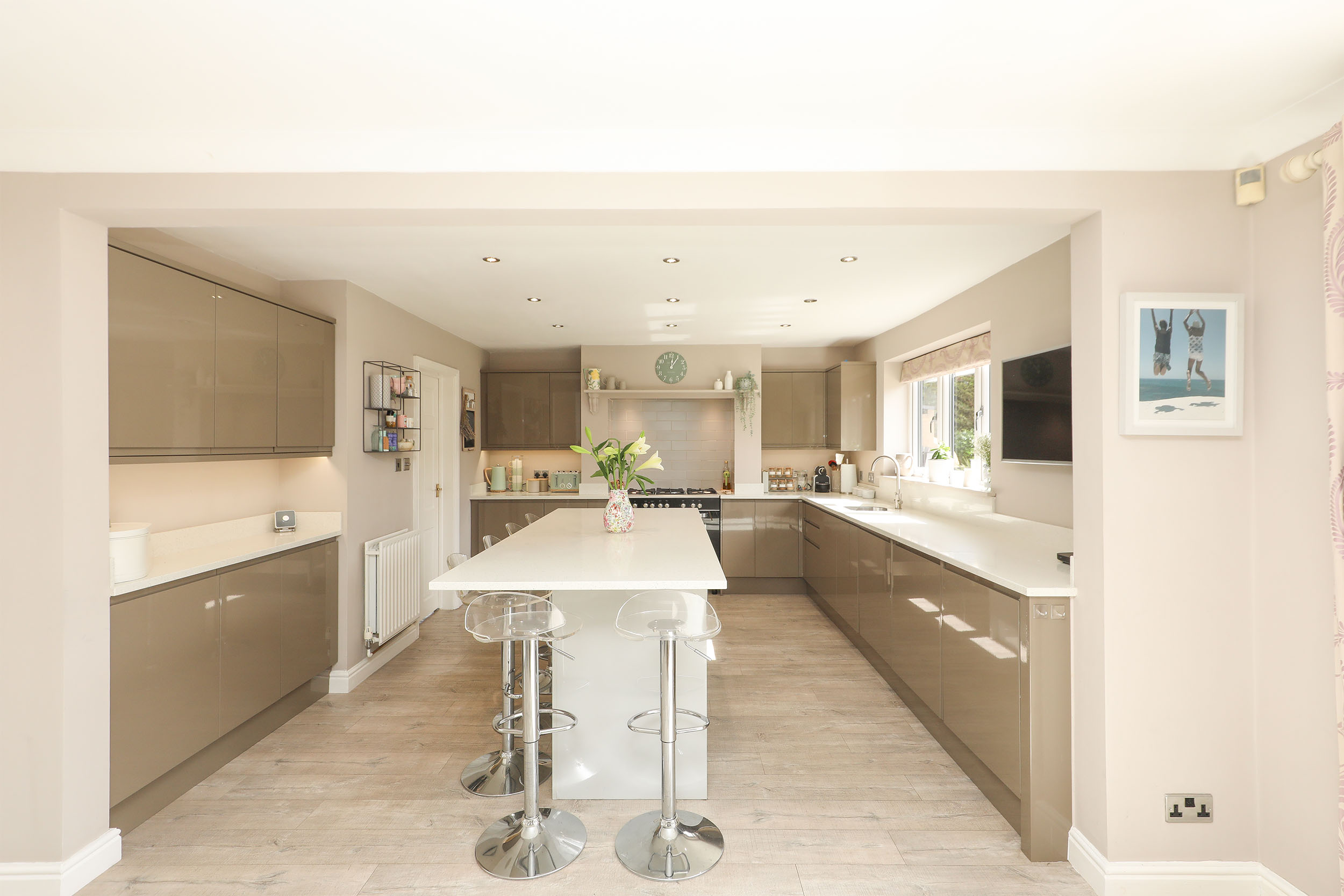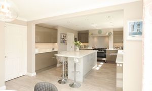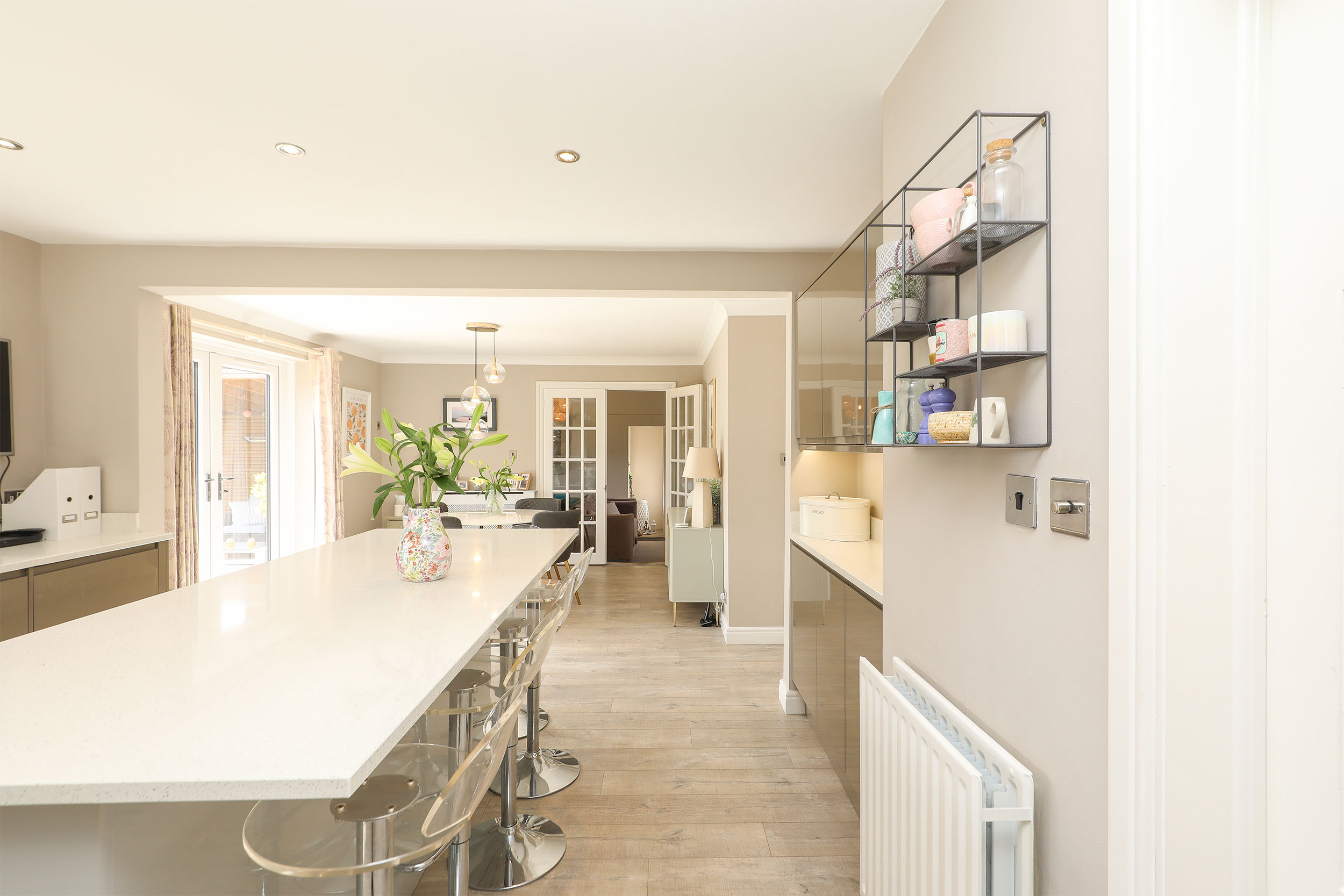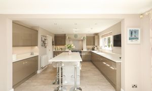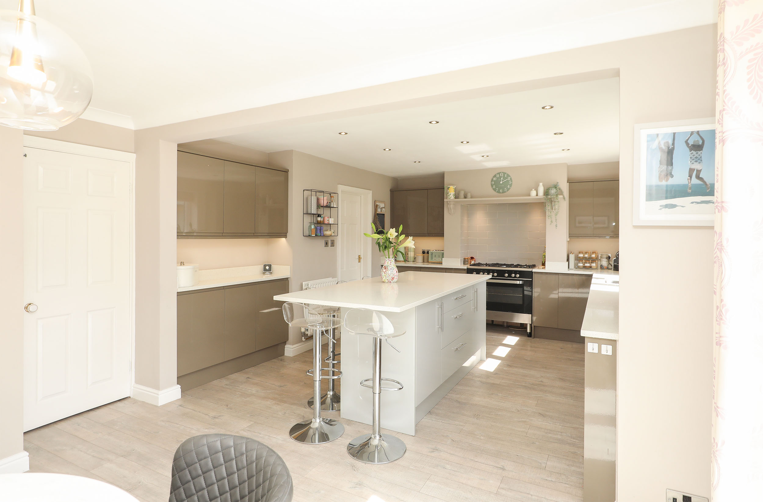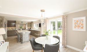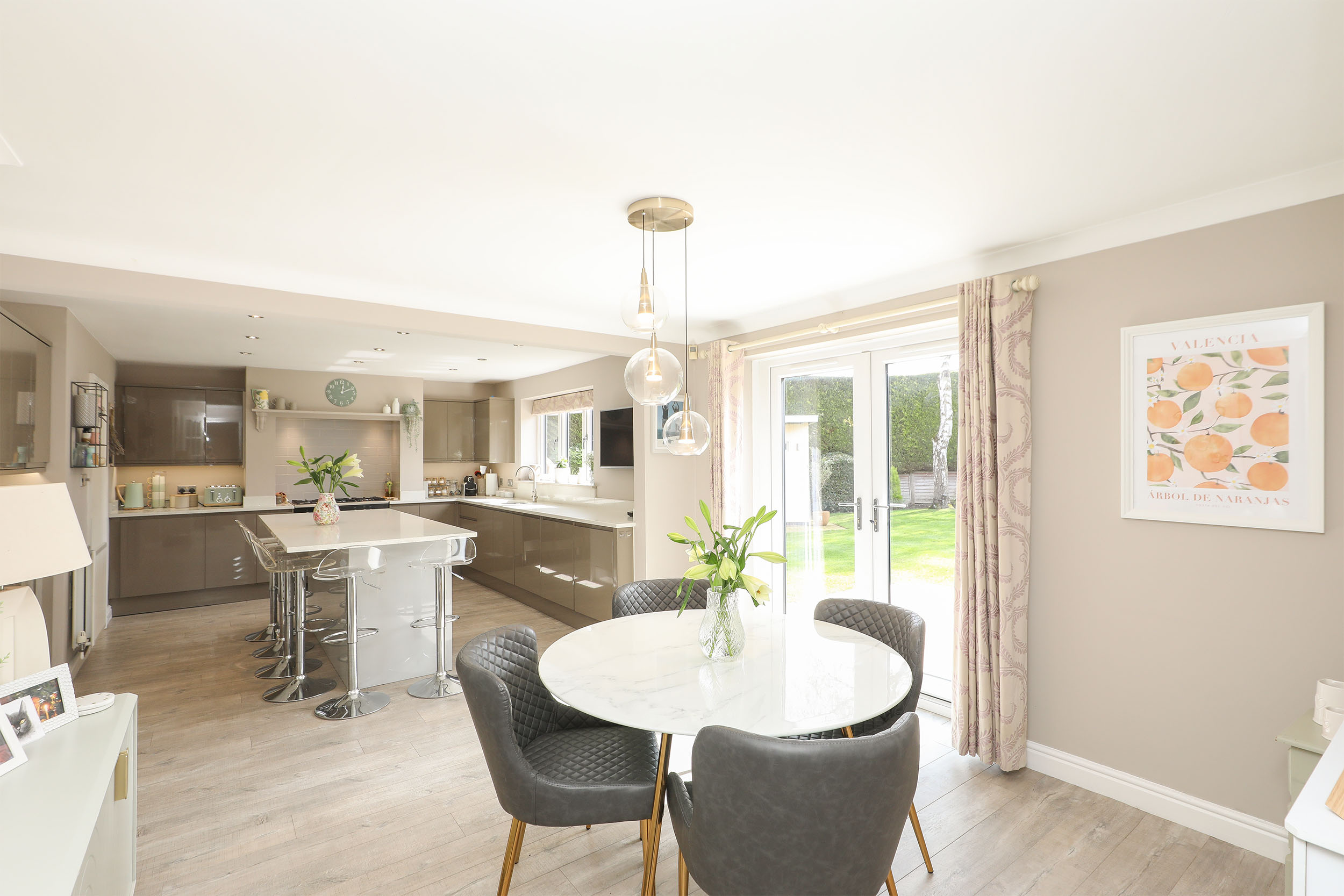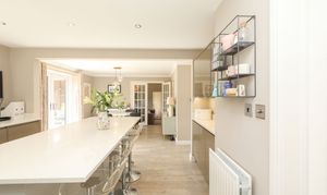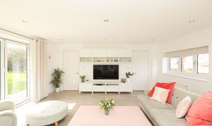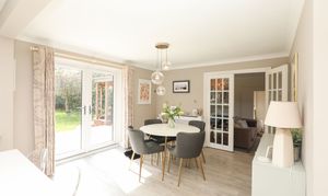 A stunning entrance hall provides an immediate sense of scale and elegance, setting the tone for the accommodation that follows. At the centre of the home is a beautifully designed open-plan kitchen and dining area, finished to an exacting standard with meticulous attention to detail. The space is centred around a feature island and complemented by a comprehensive range of high-specification integrated appliances. The dining area is perfectly suited to entertaining, enhanced further by doors opening onto the rear garden, allowing for effortless indoor-outdoor living.