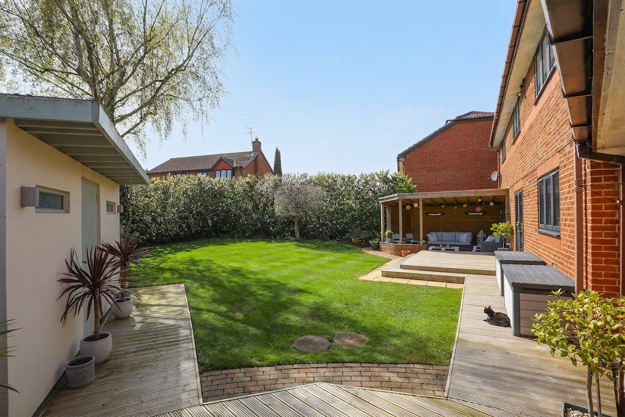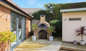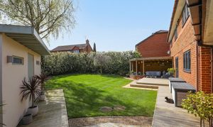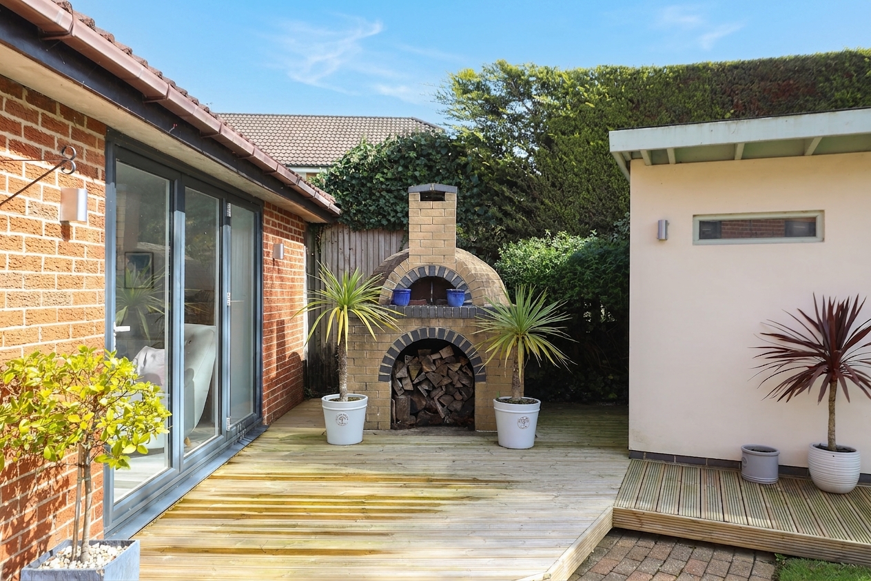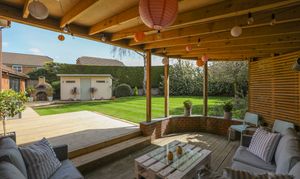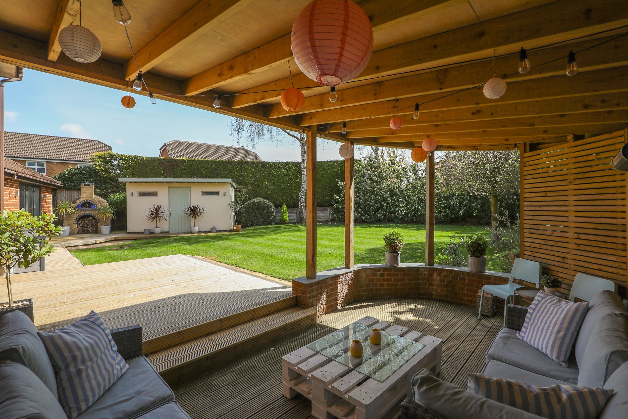 Externally, the property continues to impress. The rear garden has been meticulously landscaped and is framed by mature trees, creating a high degree of privacy. Designed with both relaxation and entertaining in mind, the garden features multiple seating areas, including a covered seating space, alongside a striking stone-built oven that provides a true focal point for outdoor gatherings. A well-maintained lawn offers an ideal space for children to play, while an external store provides additional storage.
