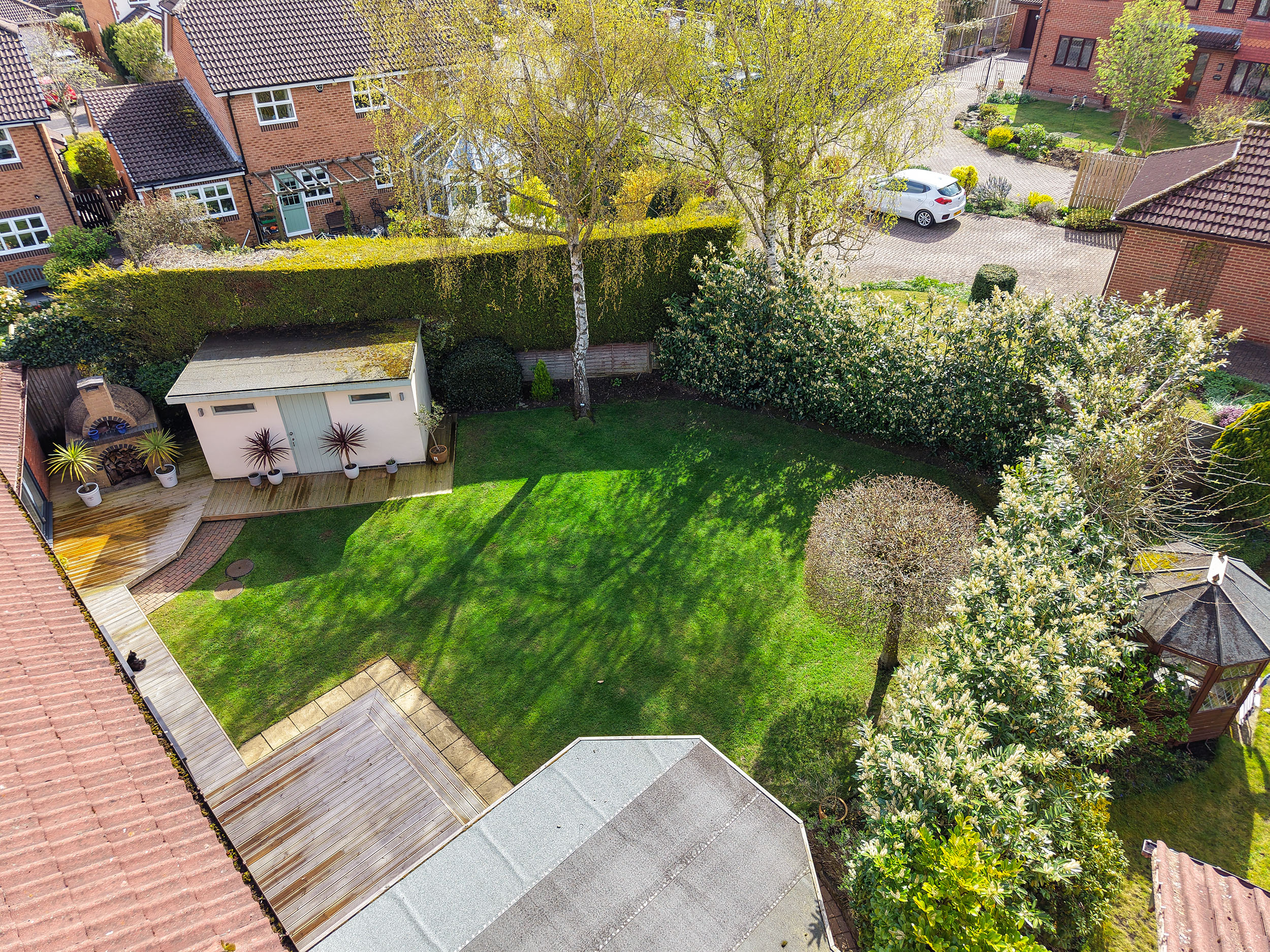 Externally, the property continues to impress. The rear garden has been meticulously landscaped and is framed by mature trees, creating a high degree of privacy. Designed with both relaxation and entertaining in mind, the garden features multiple seating areas, including a covered seating space, alongside a striking stone-built oven that provides a true focal point for outdoor gatherings. A well-maintained lawn offers an ideal space for children to play, while an external store provides additional storage and potential.