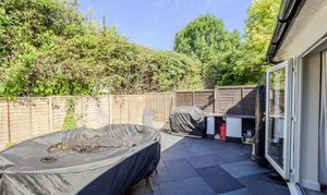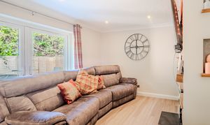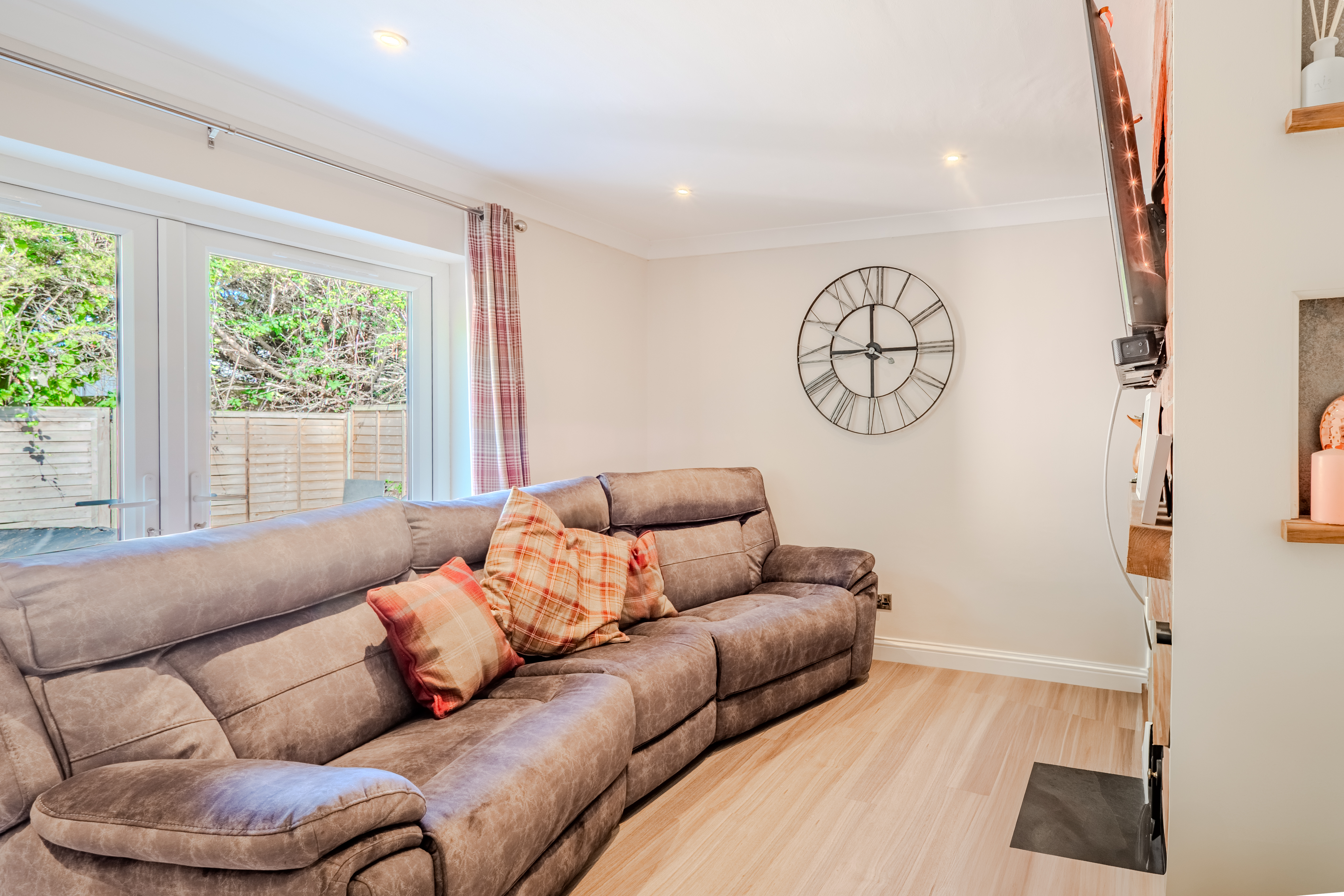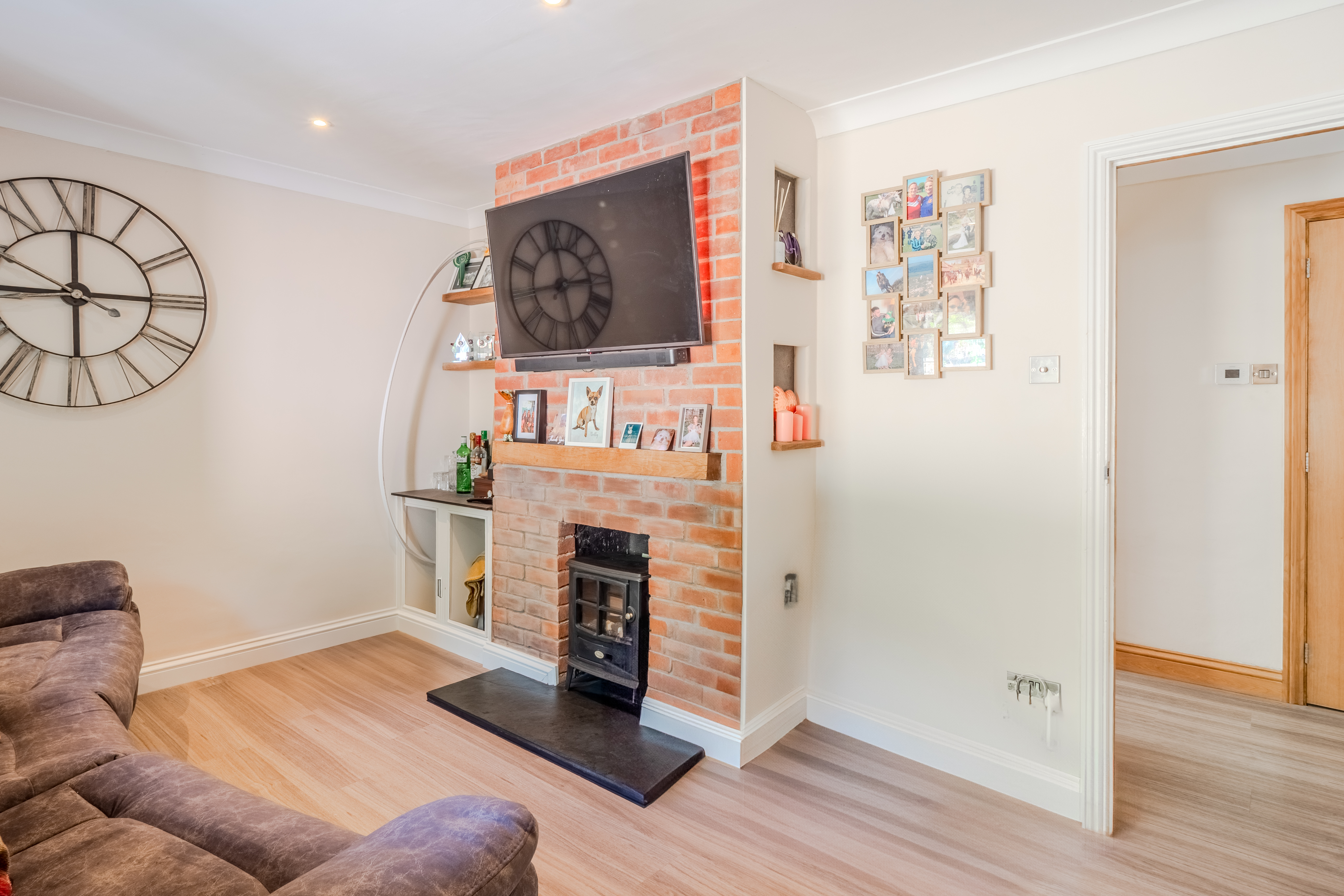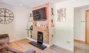 The living room, at the rear, has tasteful French doors which open fully out into the enclosed rear garden, seamlessly blending indoor and outdoor living. A feature fireplace with real brickwork offers potential for a log burner, with built in shelving to the left.