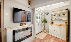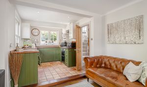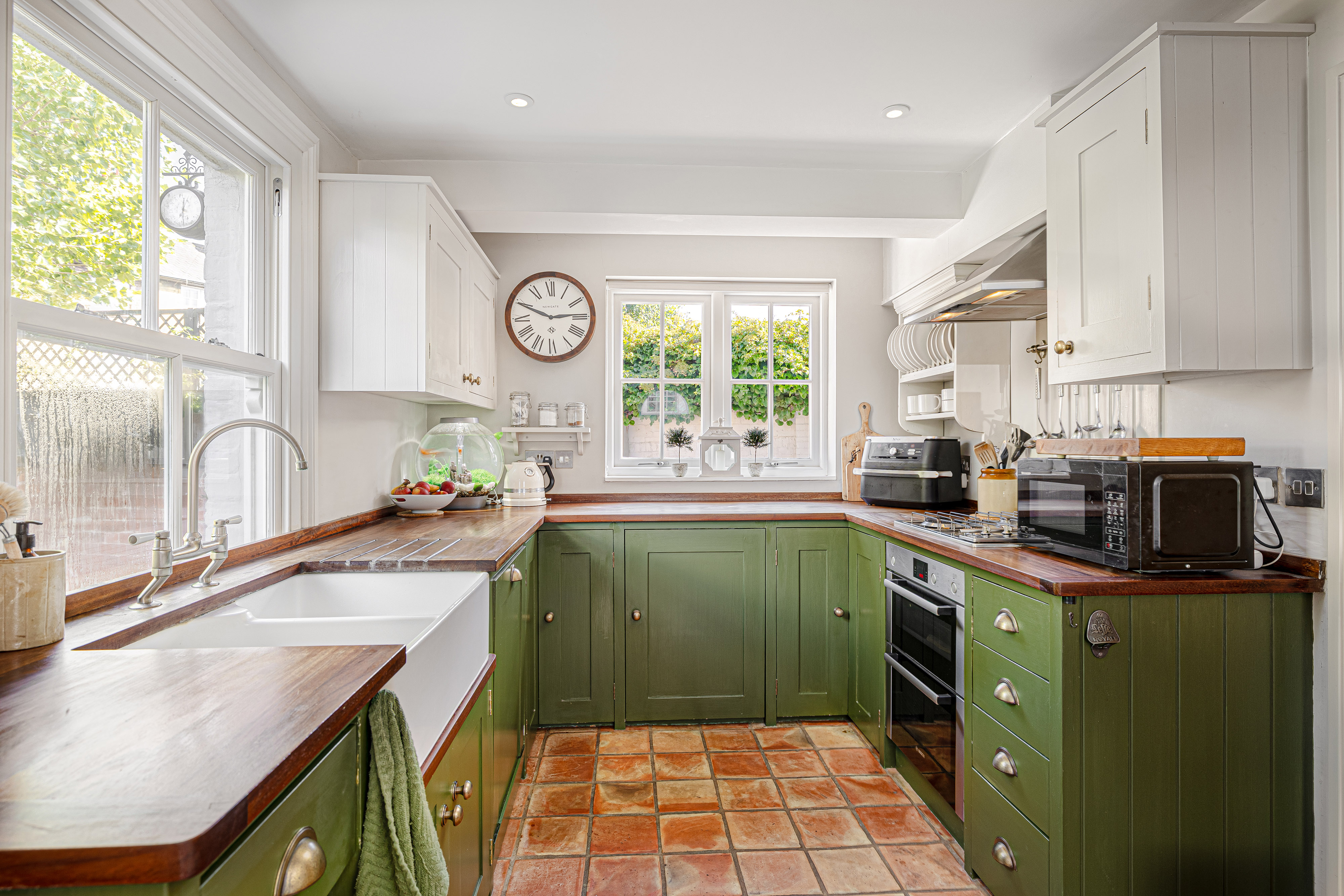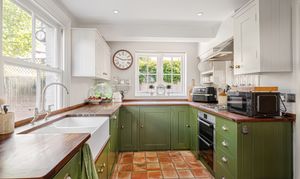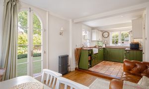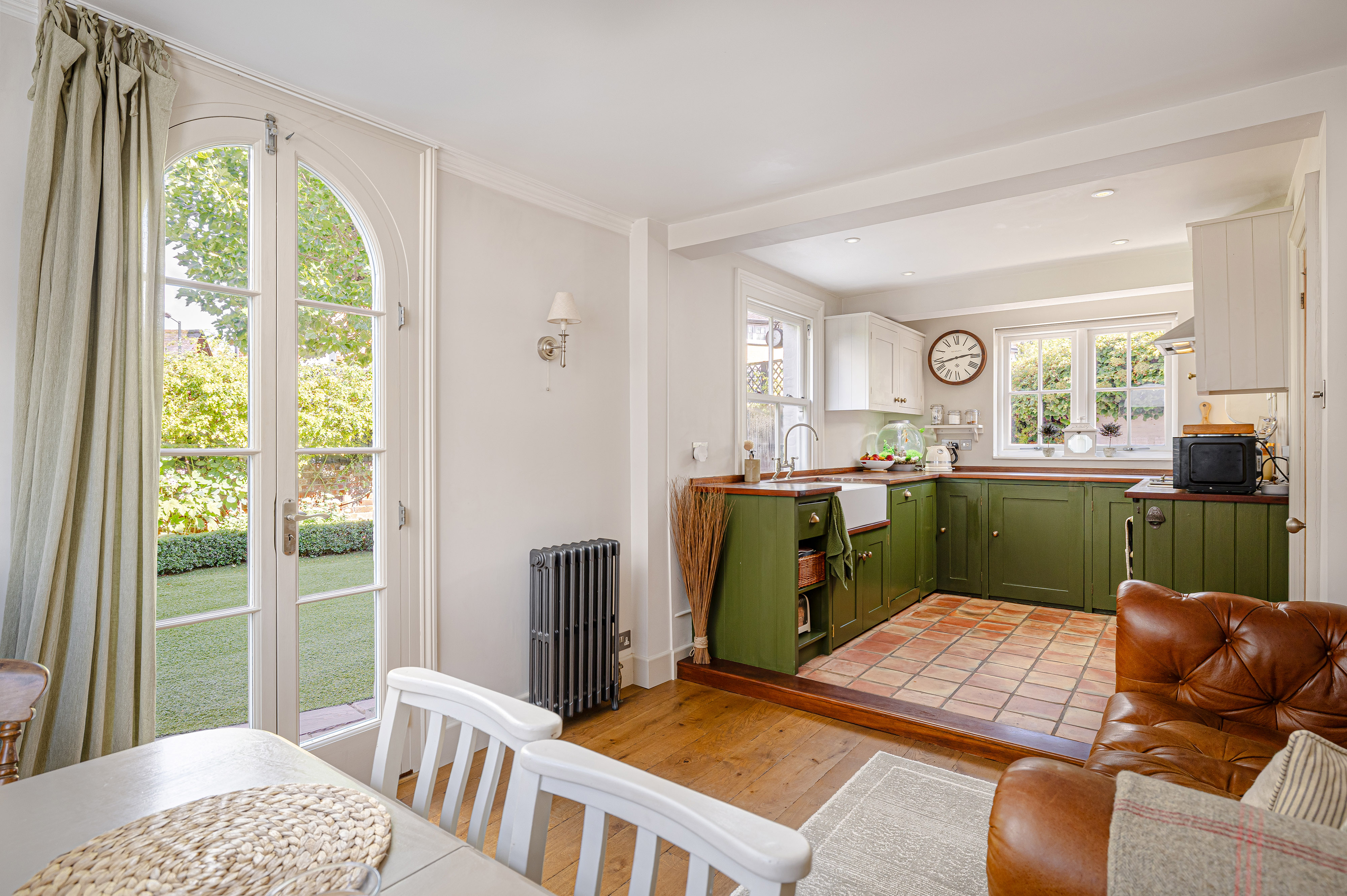- Stylish kitchen with shaker cabinetry, butler sink and open-plan dining/family area with garden access