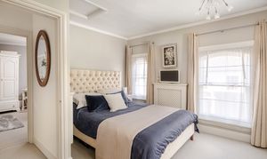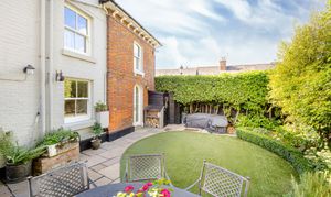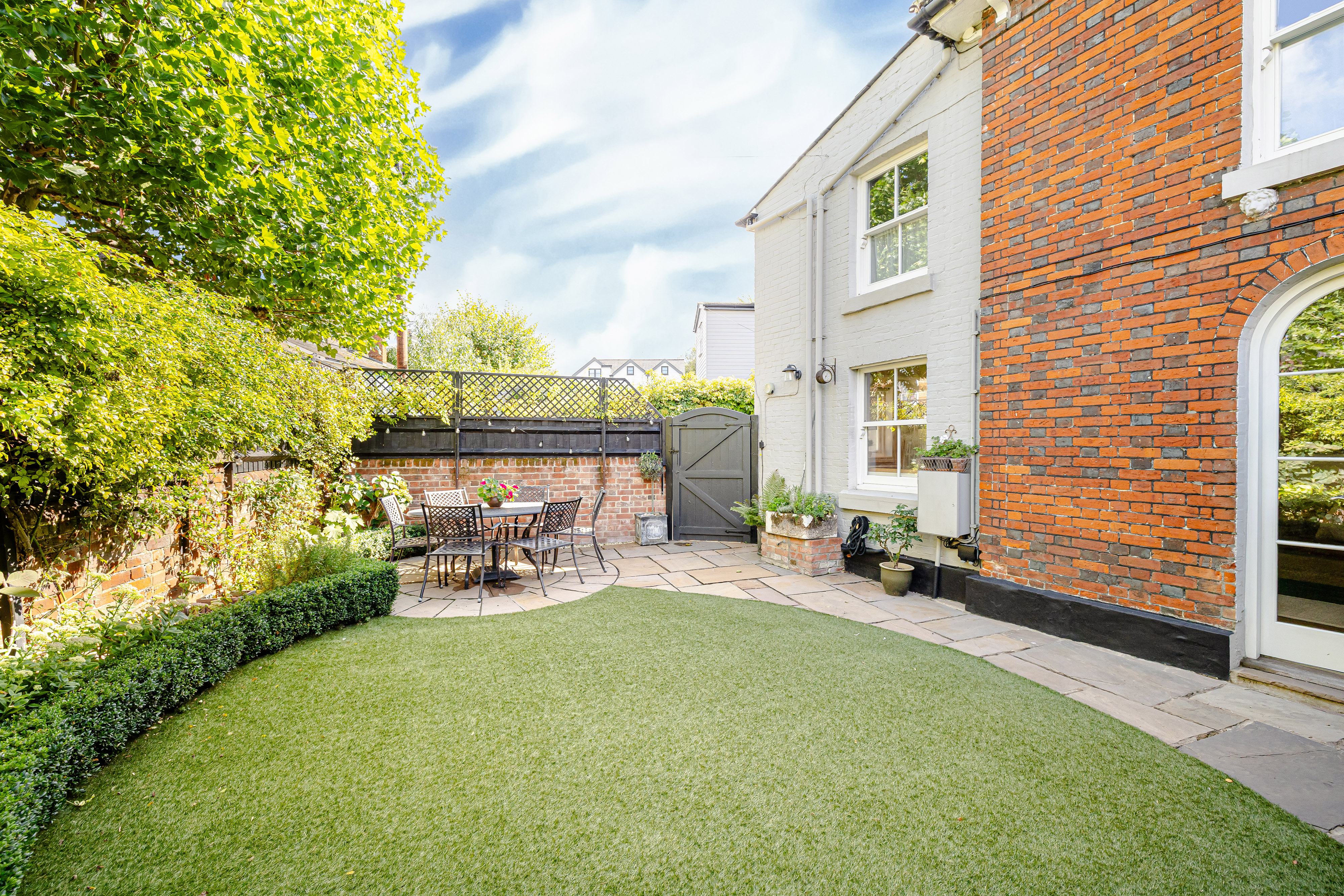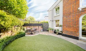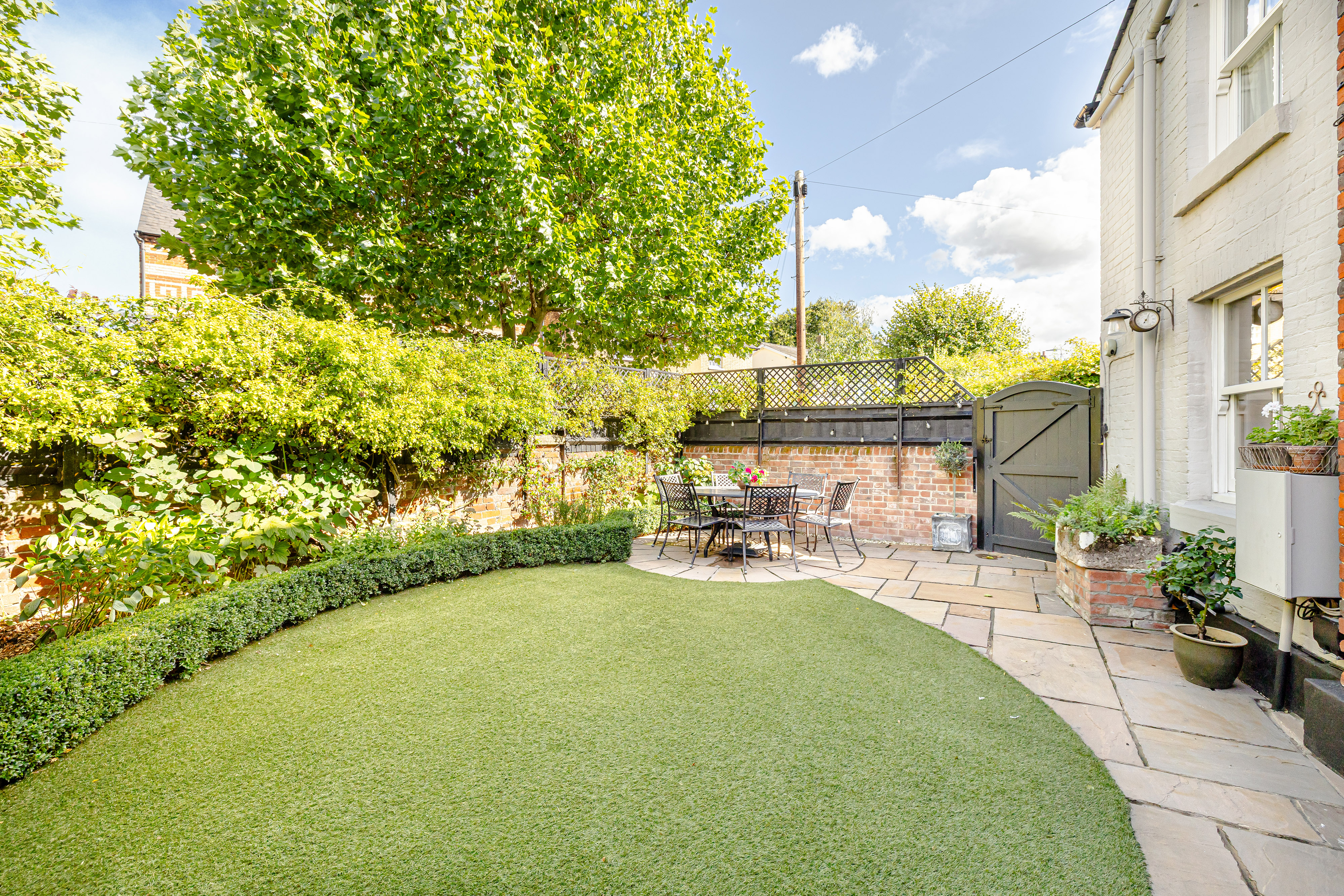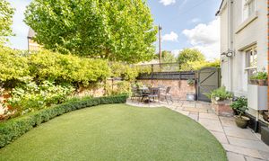 Outside, the private walled garden provides a low-maintenance yet inviting retreat, with a circular terrace and mature borders. To the rear, a gated driveway ensures secure off-street parking for three cars.