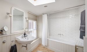 Upstairs, three bedrooms are arranged around a central landing. The two principal rooms are generous doubles with excellent storage, while the third is ideal as a child’s bedroom or study. A stylish family bathroom with painted panelling, metro tiling, and a skylight completes the first floor.