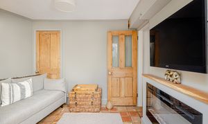 The ground floor includes a welcoming hallway with terracotta tiled flooring and a staircase to the first floor. A sitting room with an elegant fireplace and shuttered windows provides a calm retreat, while the separate dining room is perfect for entertaining. To the rear, the bespoke kitchen features shaker-style cabinetry, butler sink, and wooden worktops, flowing into a bright dining/family area with French doors to the garden. A snug and utility/WC complete the layout, offering flexibility for home working or family use.