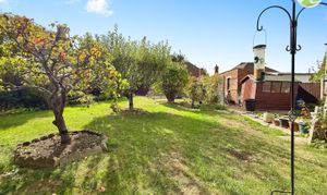 Adding to its allure, this refined property boasts a double-length garage, a testament to its practicality and convenience. The expansive plot size accentuates the outdoor potential, with a driveway leading to the garage and a well-established rear garden featuring lush fruit trees, ideal for serene moments amidst nature's embrace.