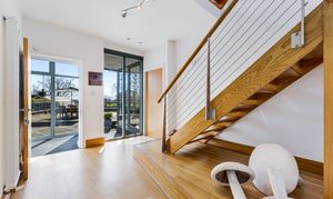 Outside, the angled, glass-fronted exterior commands a position above a gated brick-paved driveway and double garage with its stylish roof-top deck. Step through the front door into a useful porch before entering the light-drenched hallway. Here, you’re met by a beautifully crafted Ash staircase with a Beech handrail, offering a striking line of sight to the top floor and complementing the oak flooring and internal doors.