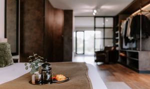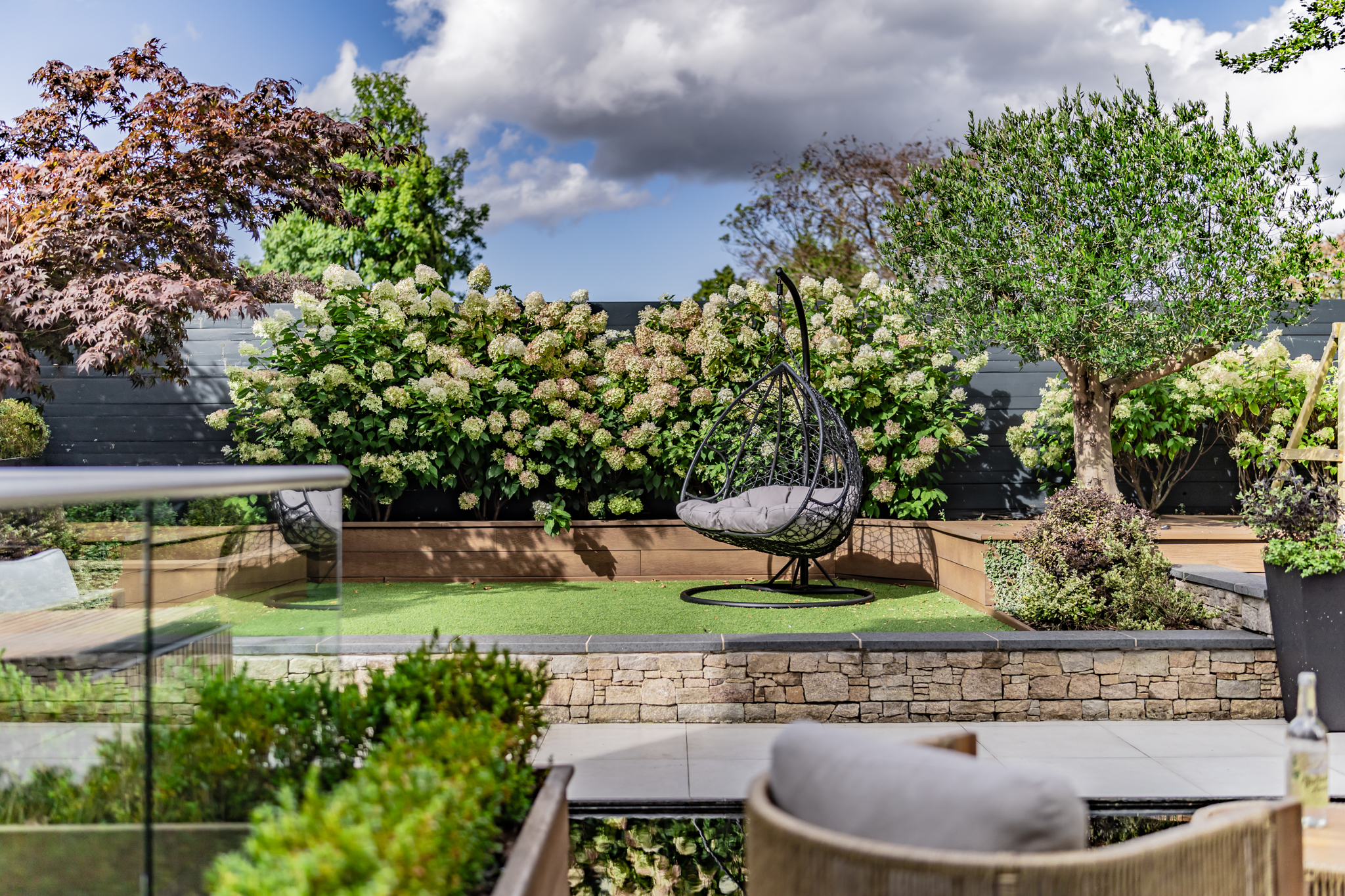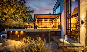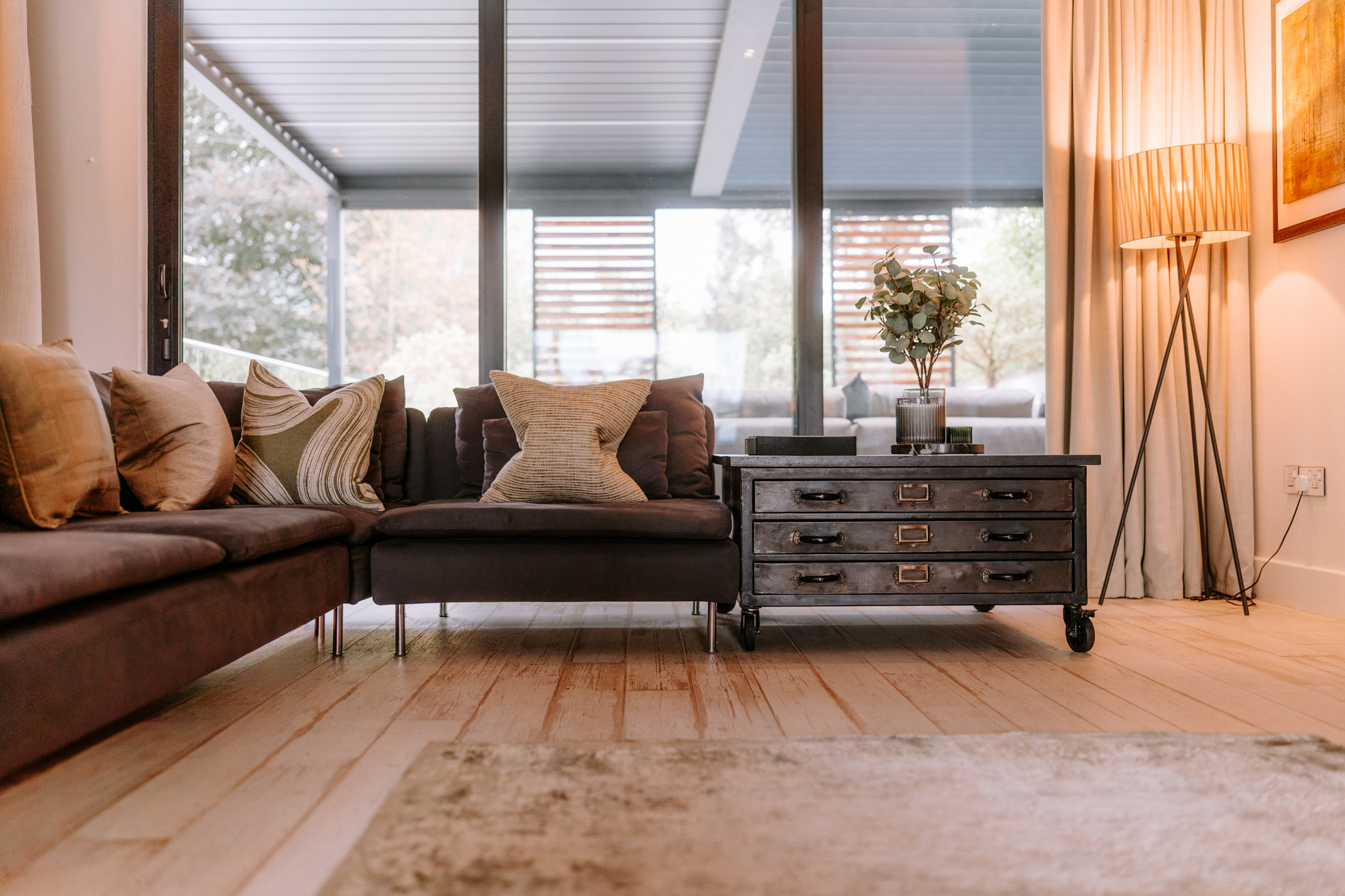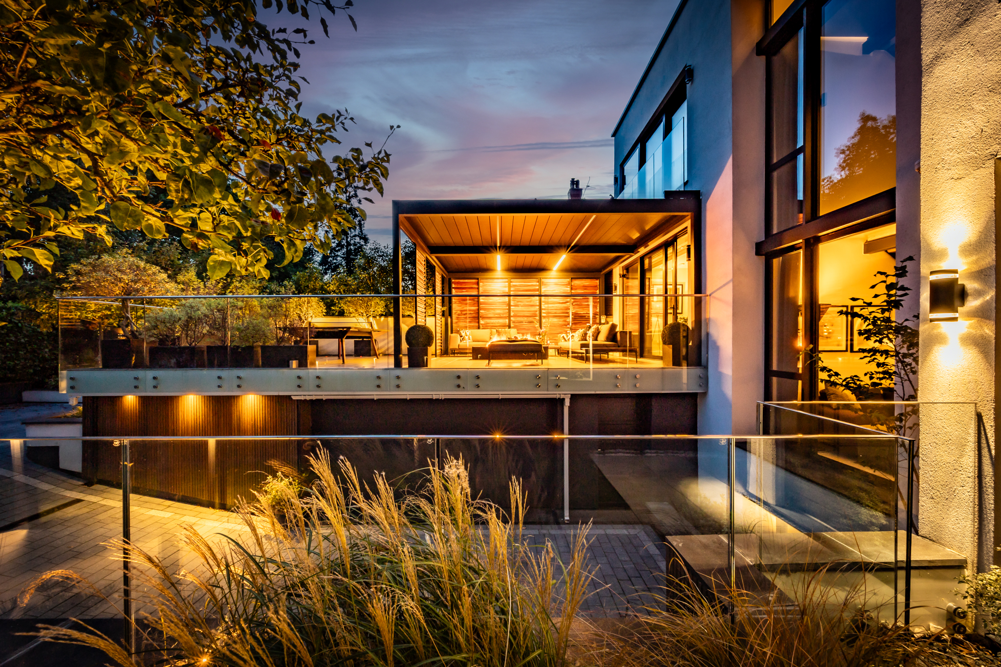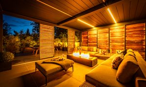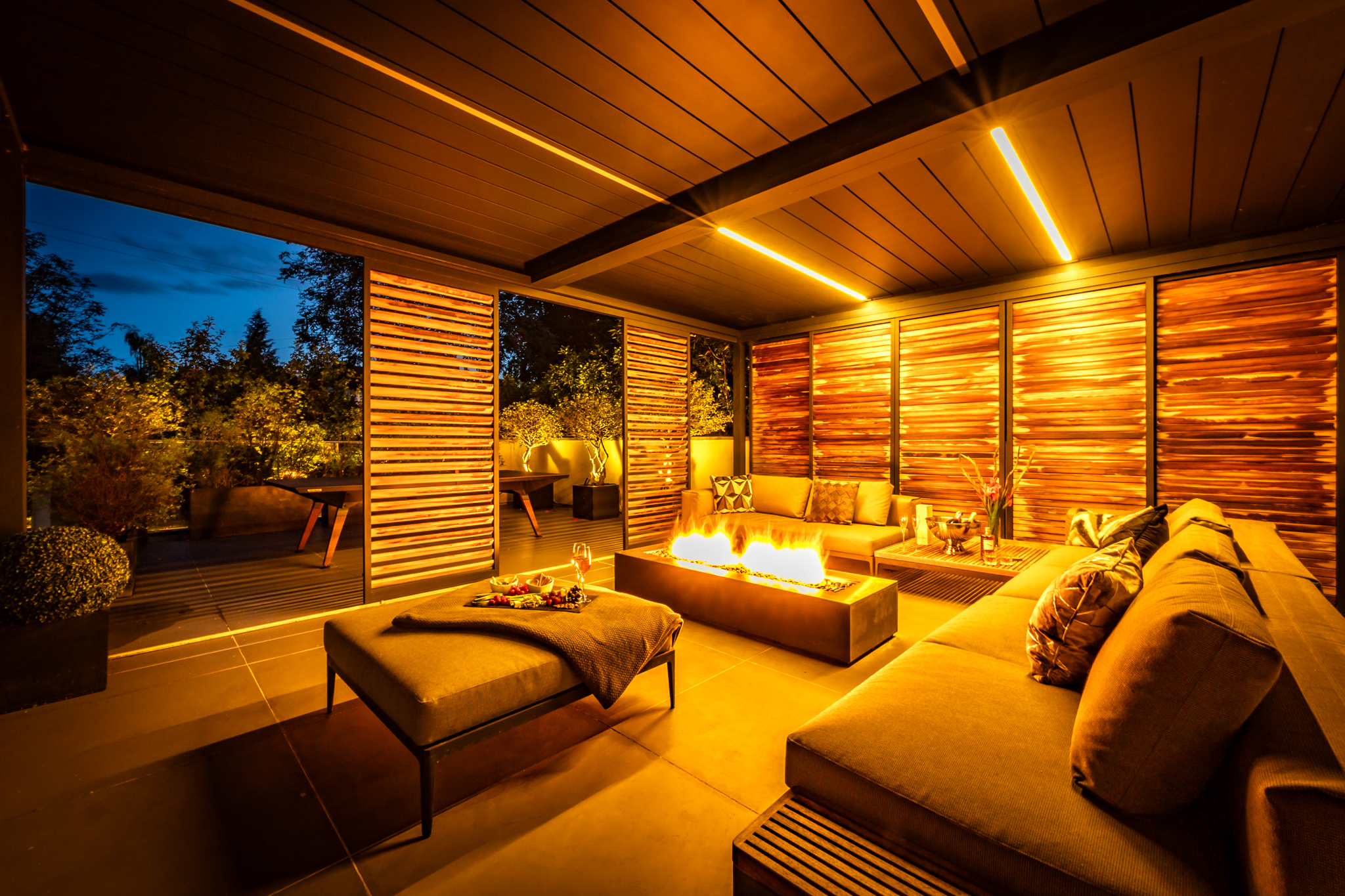 - Landscaped outdoor sanctuaries featuring a private terrace with slatted screens, louvered roof, sculptural fire table, integrated lighting, and lush greenery for year-round enjoyment.
