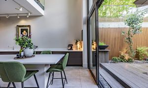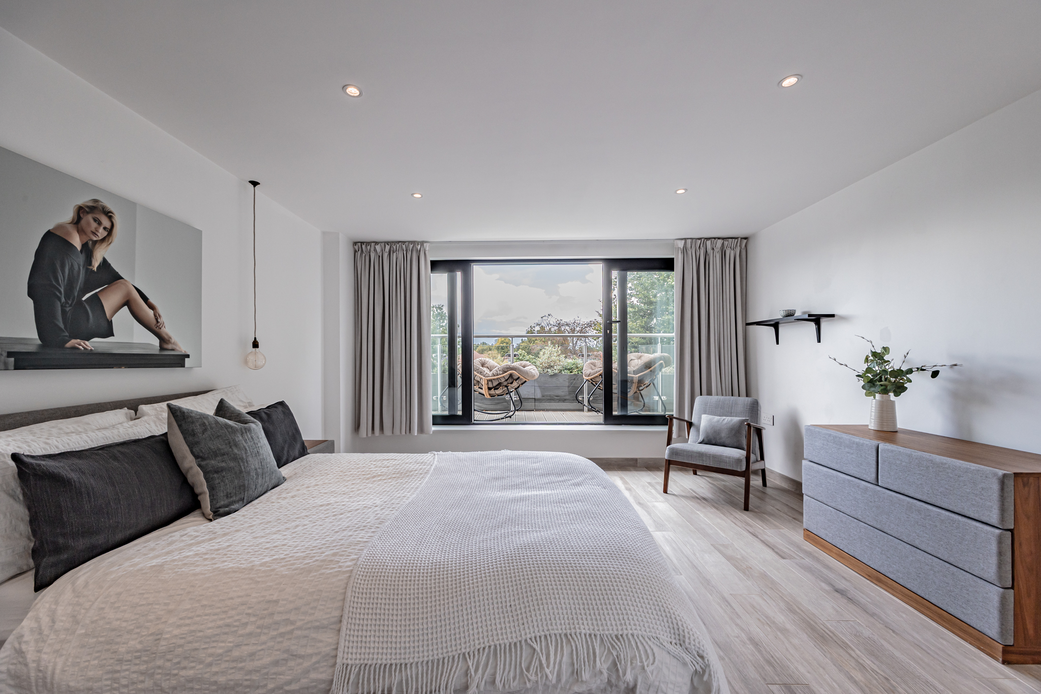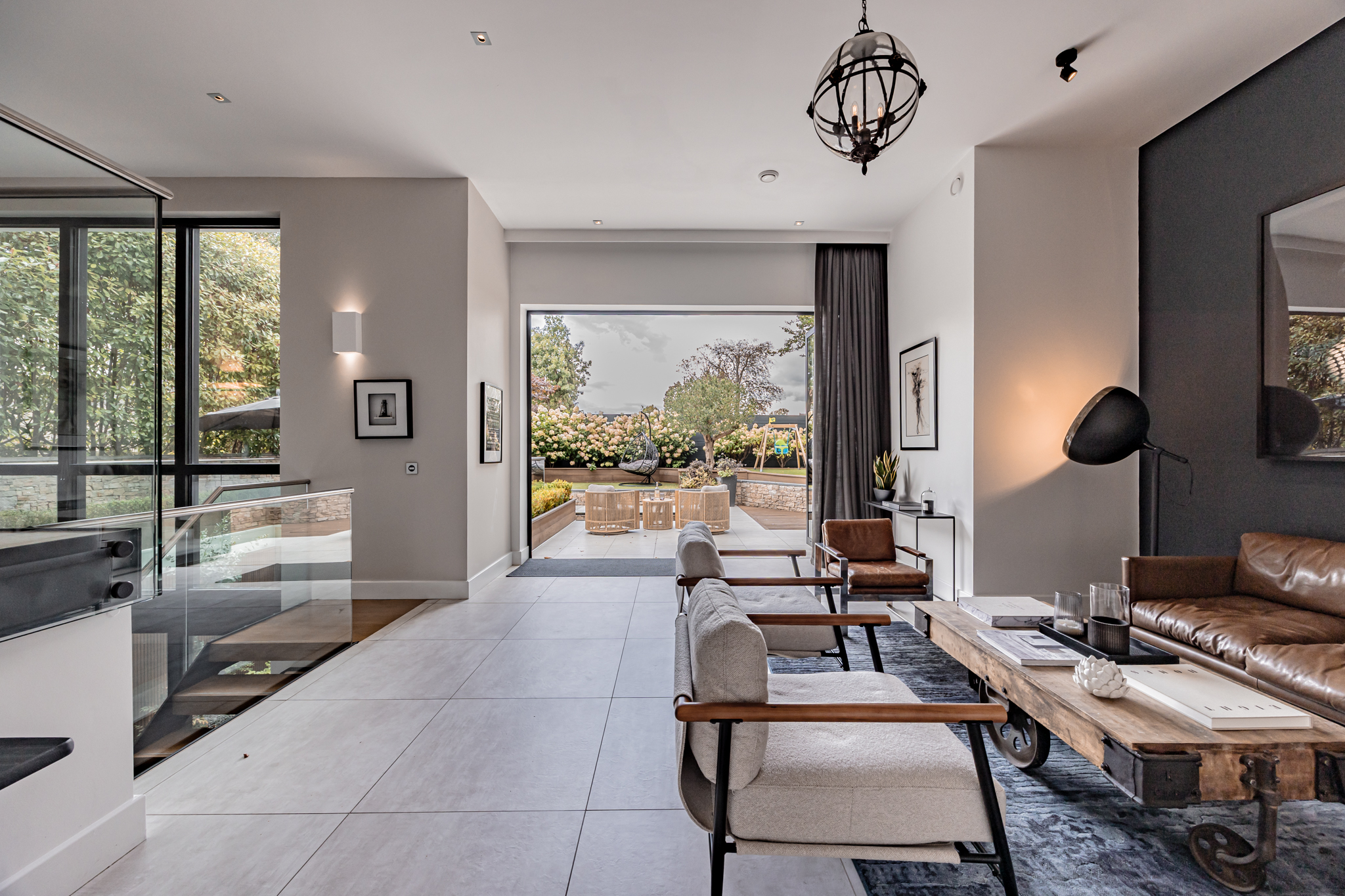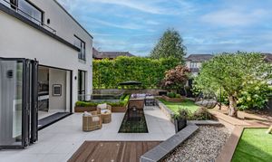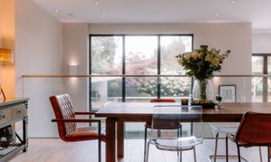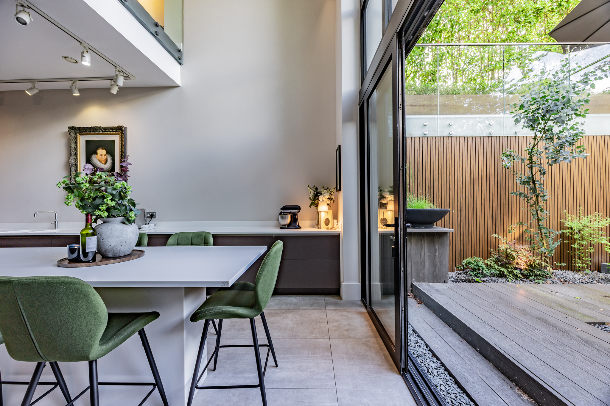 Inside, the residence reveals a series of meticulously designed spaces, where multiple living areas and bespoke home offices are enhanced by a harmonious blend of luxury tile and wood flooring. At the heart of the home lies a showpiece kitchen, a true statement in modern luxury, featuring sculpted worktops, a Quooker tap, built-in bar, and an expansive island that integrates three NEFF ovens, dual wine and beer coolers, an ice maker, induction hob, and twin sinks, while floor-to-ceiling sliding doors extend onto a beautifully decked private courtyard, creating an exquisite setting for seamless indoor-outdoor living.