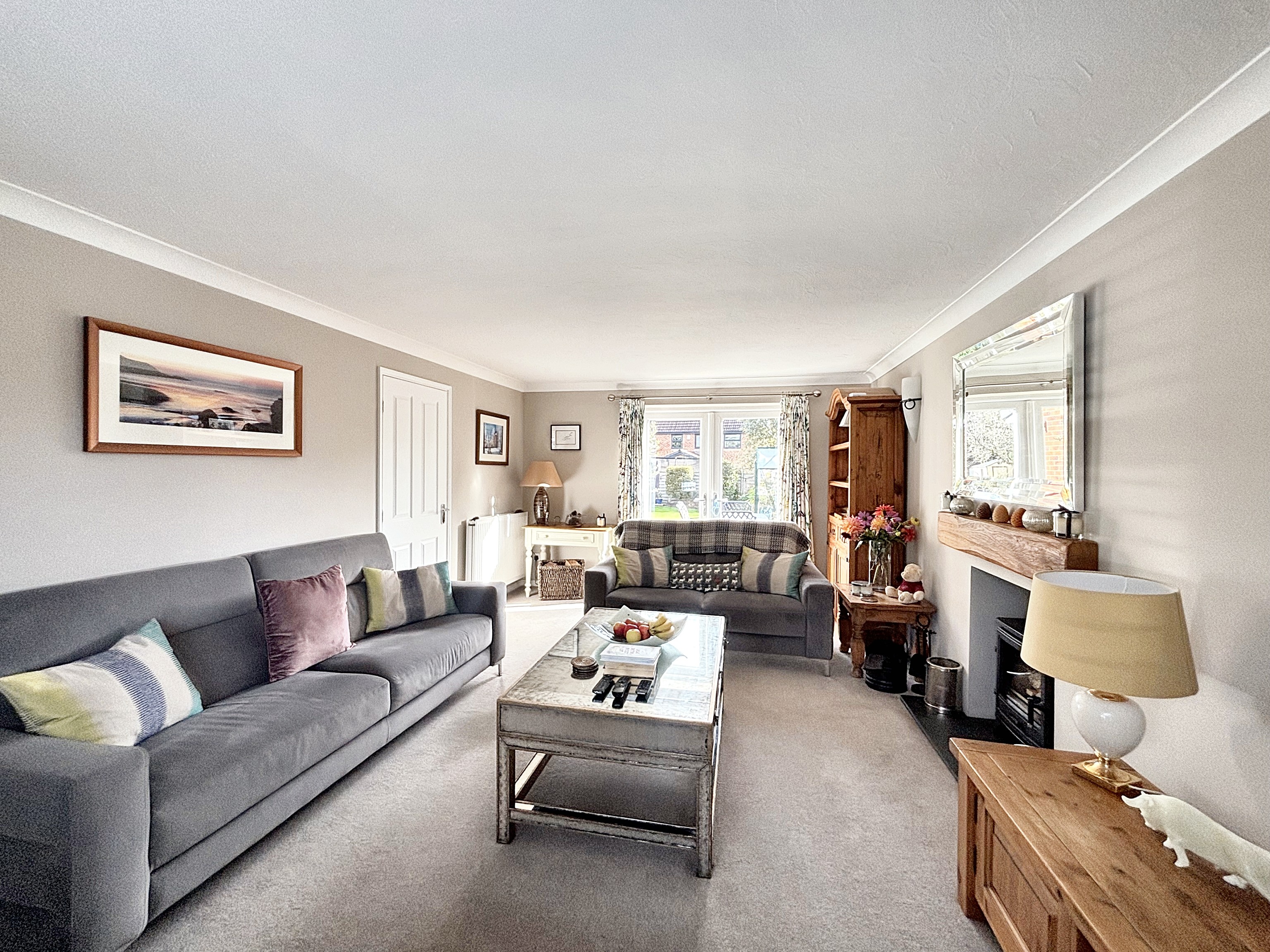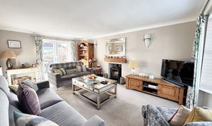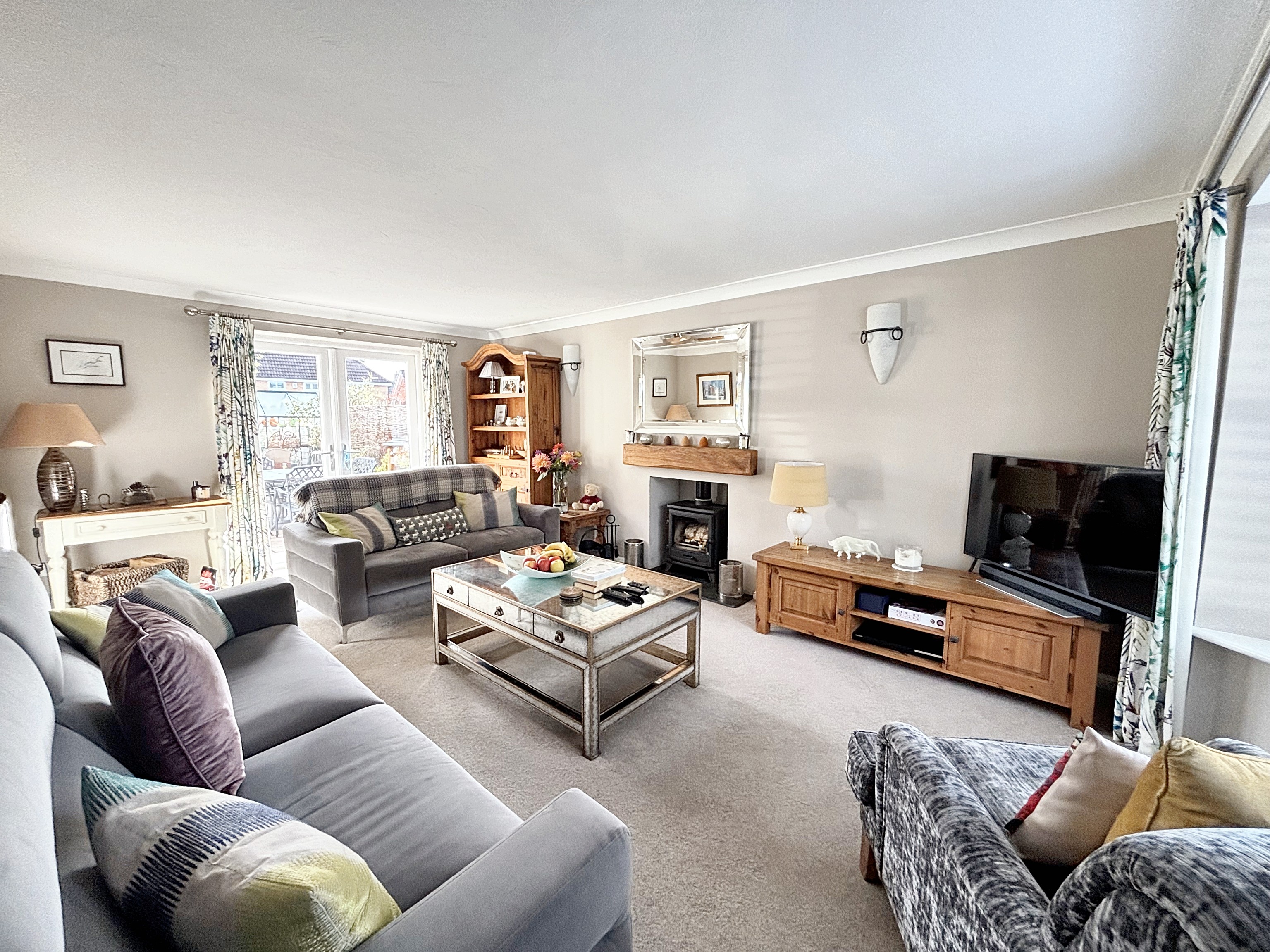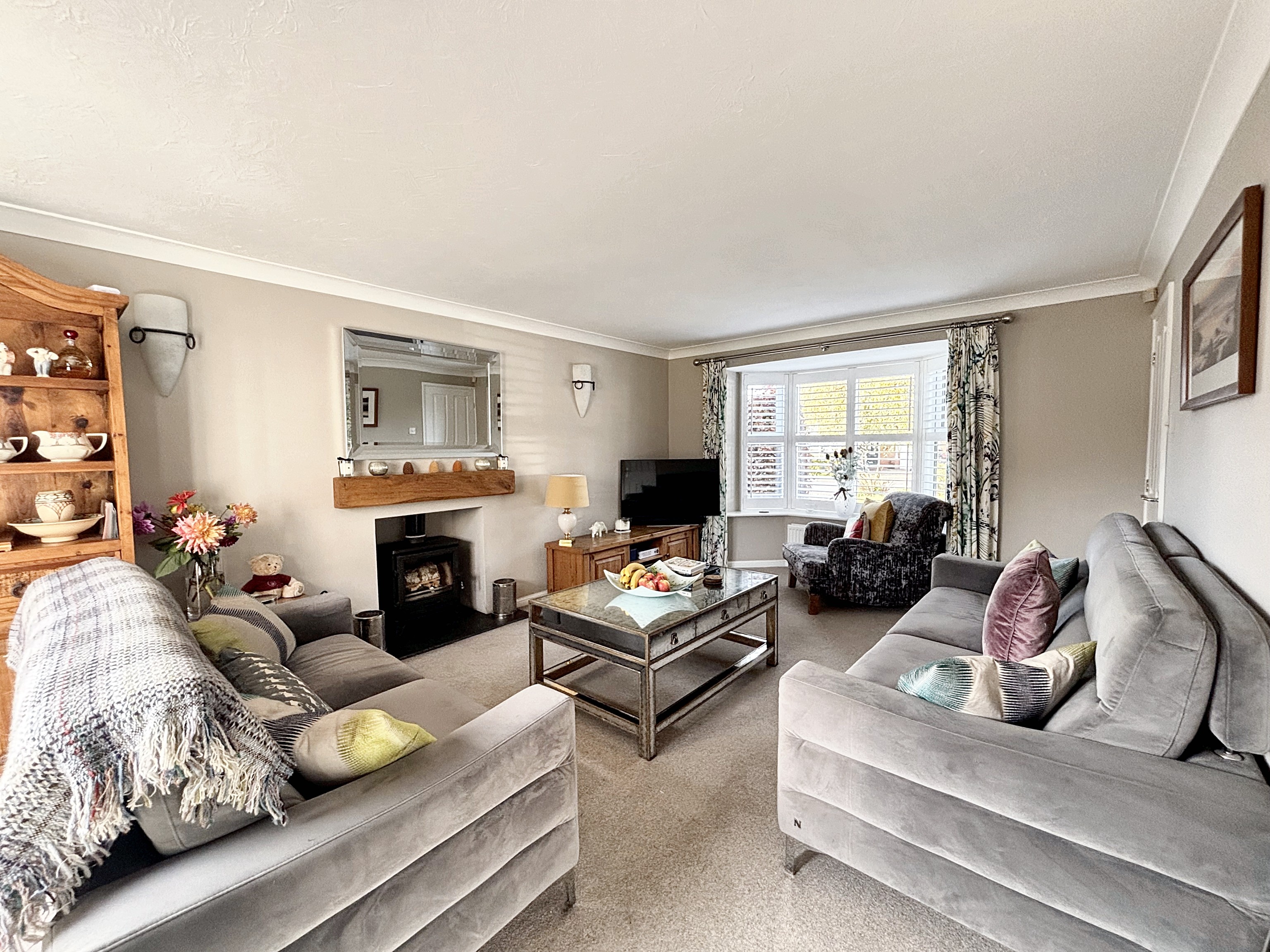 Dual aspect with a bay window to the front elevation complete with fitted plantation shutters and French doors to the rear elevation leading out to a paved patio. Feature fire surround complete with a dual fuel log burning stove. Ceiling coving. T.V point. Internal door leads into the kitchen/diner/family room.