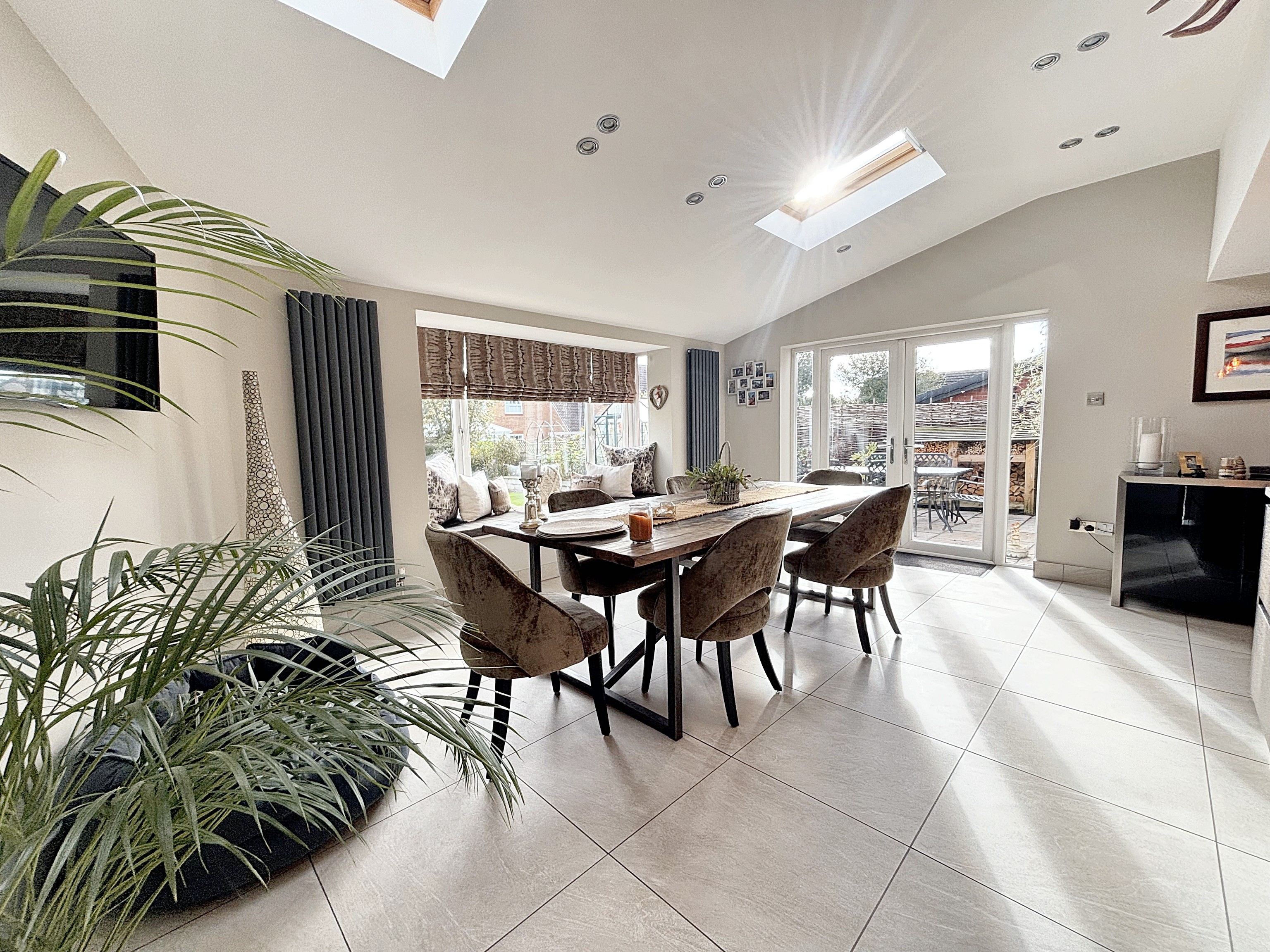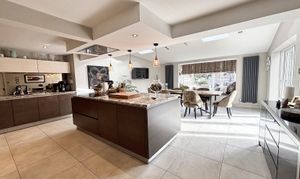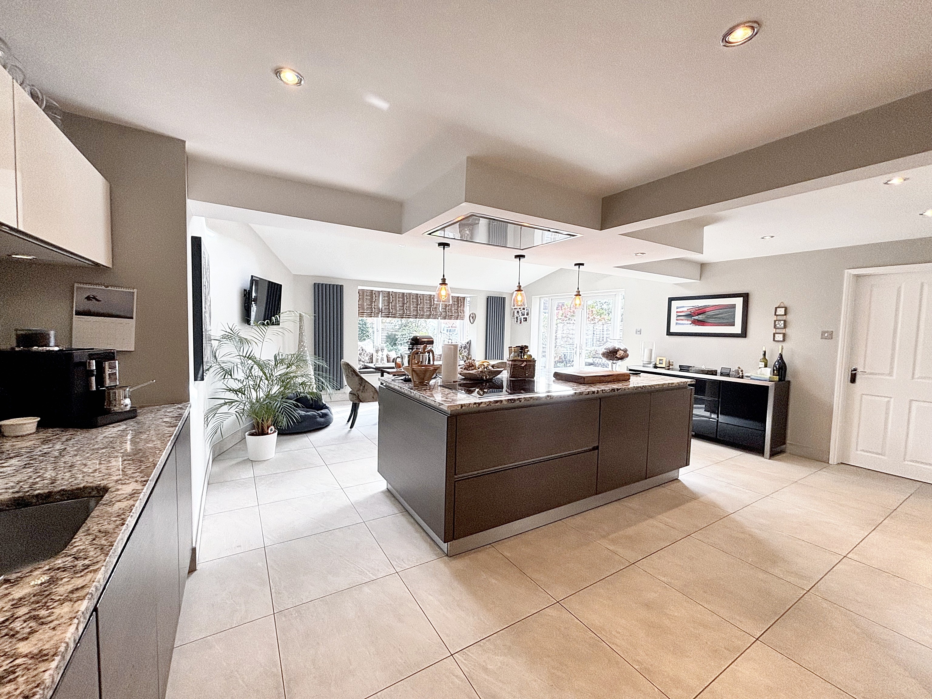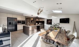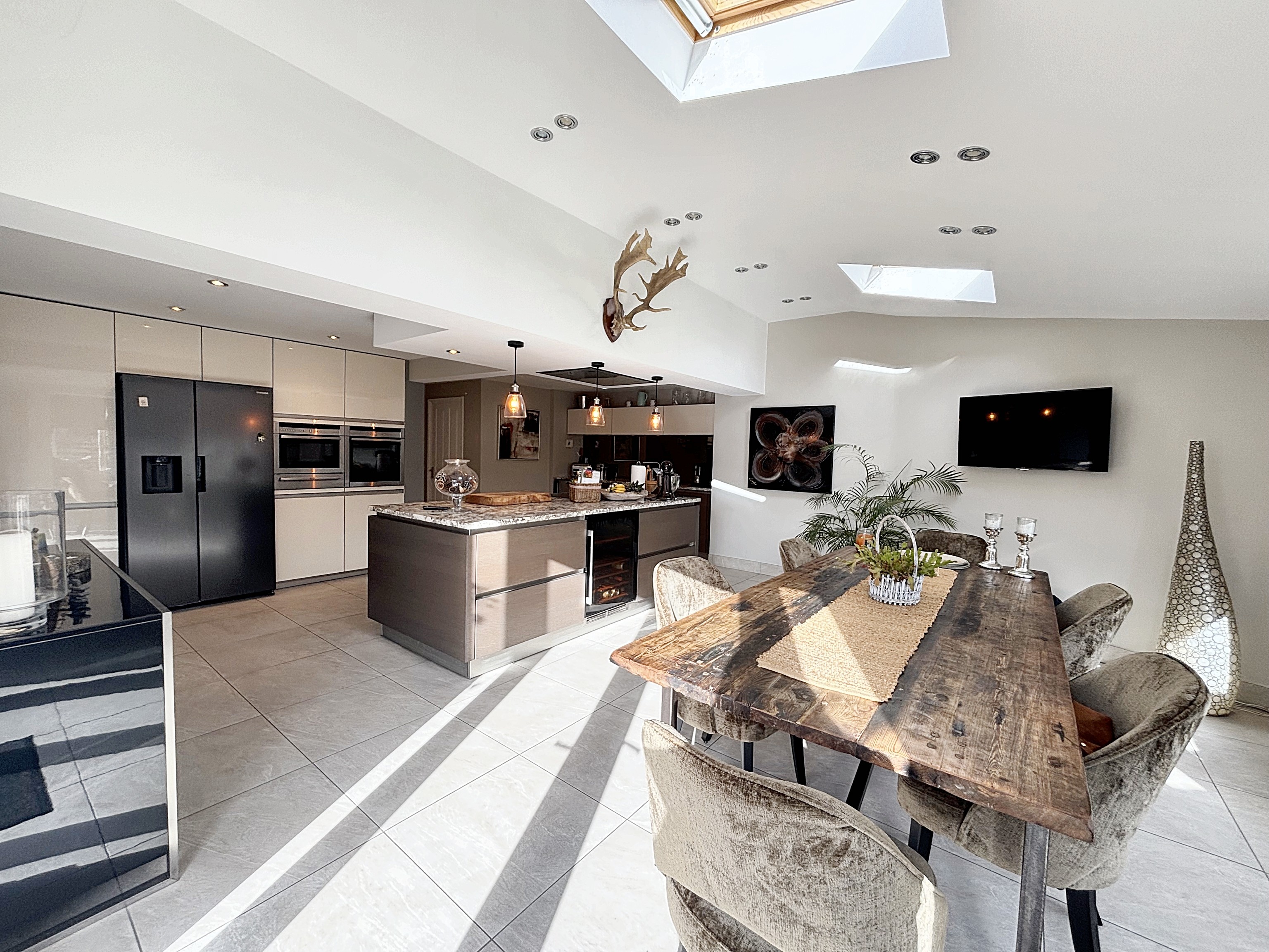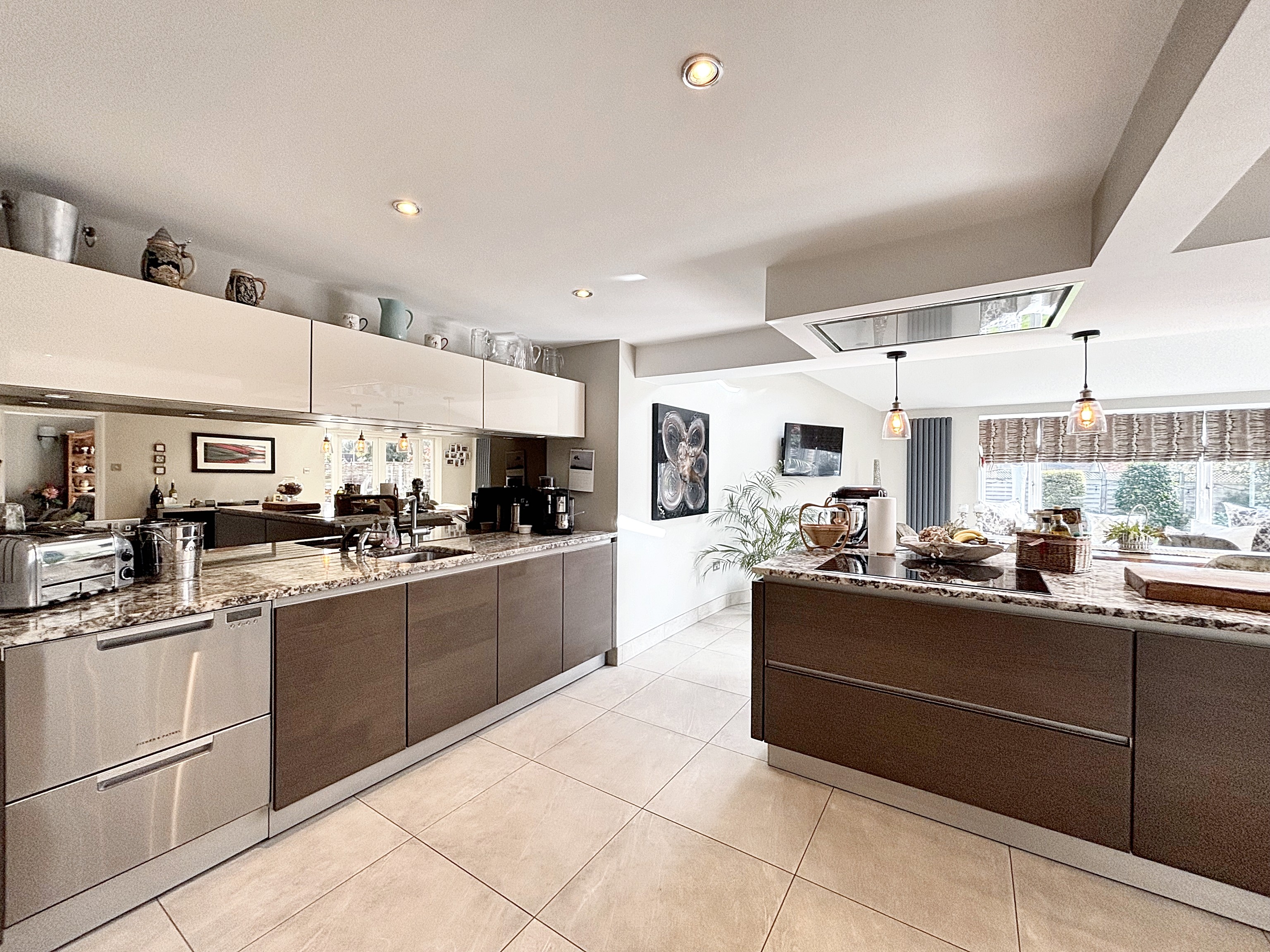 Fitted with a modern handless German kitchen complete with a range of wall and base units complete with marble work surfaces and and integrated appliances including: Wine Fridge, Neff Induction Hob, Extractor Hood, Neff slip and slide Ovens and Warming Draw with spaces for a an American Style Fridge/Freezer and a Dish Washer. Other features of this wonderful kitchen include internal draws within the kitchen cupboards making the most of the storage space and a Quooker instant hot water tap. Inset spotlights. Fully tiled floor. T.V point. Vaulted ceiling complete with sky light. Feature box window seat with views over the landscaped rear garden. French door to the side elevation with a window to both sides provides access to a private paved patio area.