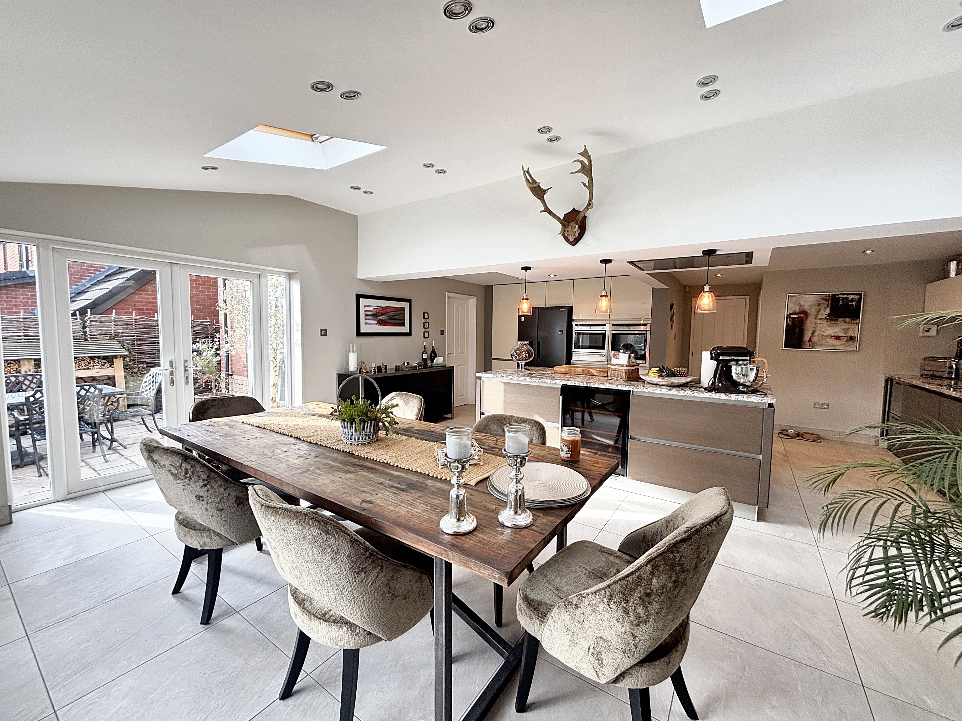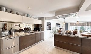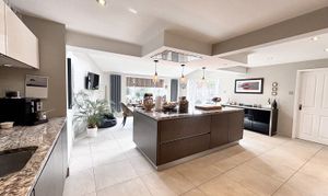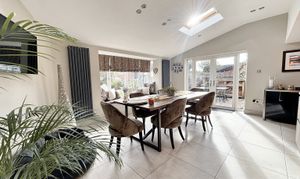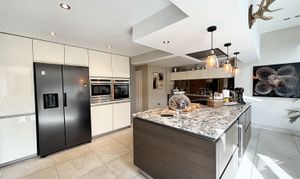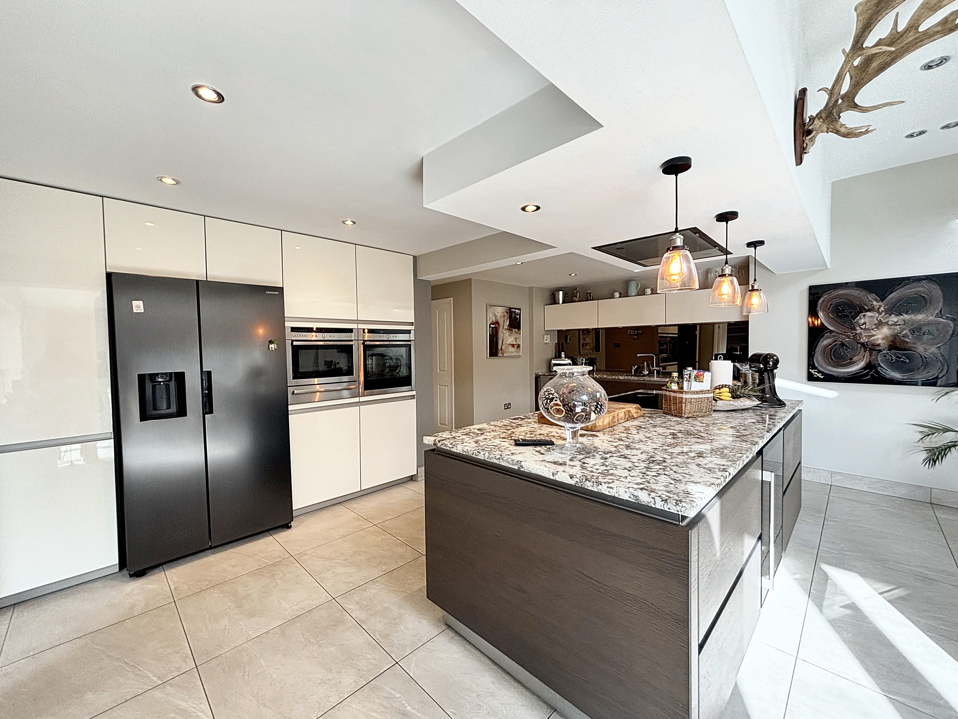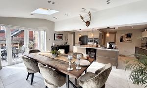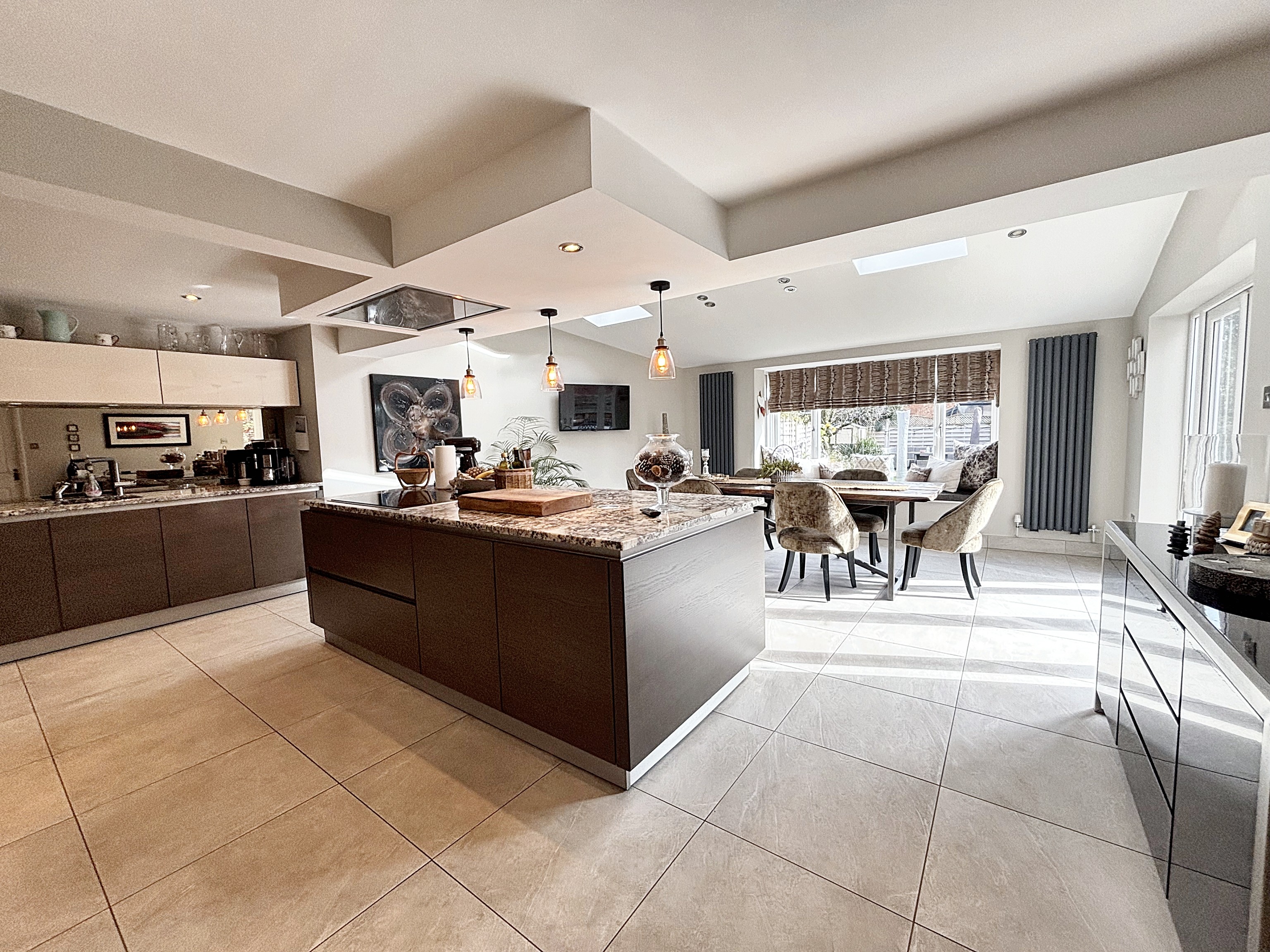 Fitted with a modern handless German kitchen complete with a range of wall and base units complete with marble work surfaces and and integrated appliances including: Wine Fridge, Neff Induction Hob, Extractor Hood, Neff slip and slide Ovens and Warming Draw with spaces for a an American Style Fridge/Freezer and a Dish Washer. Other features of this wonderful kitchen include internal draws within the kitchen cupboards making the most of the storage space and a Quooker instant hot water tap. Inset spotlights. Fully tiled floor. T.V point. Vaulted ceiling complete with sky light. Feature box window seat with views over the landscaped rear garden. French door to the side elevation with a window to both sides provides access to a private paved patio area.