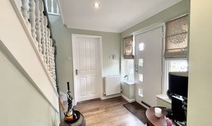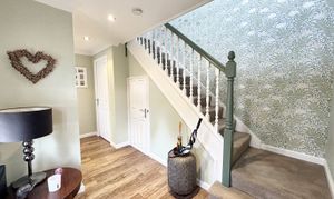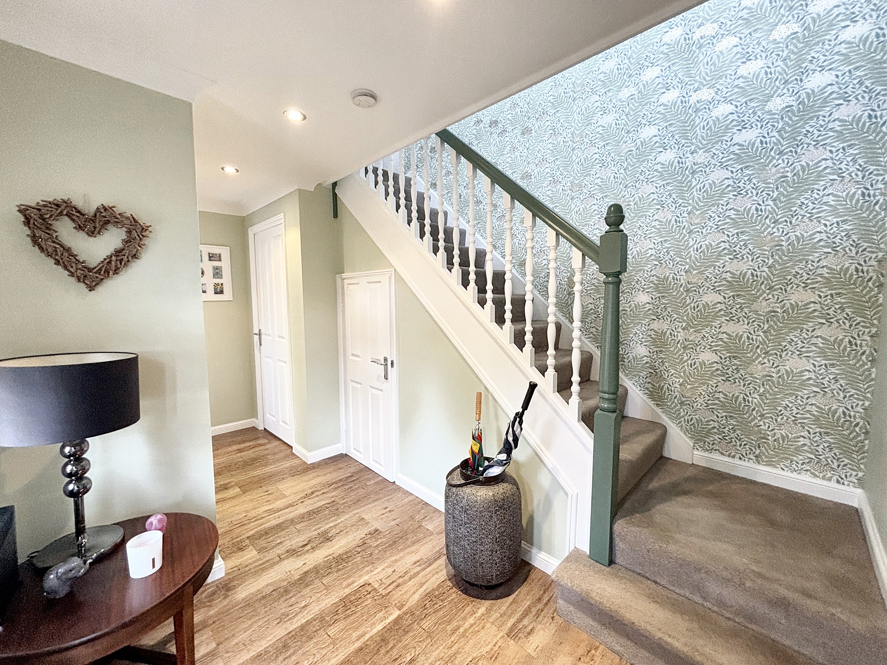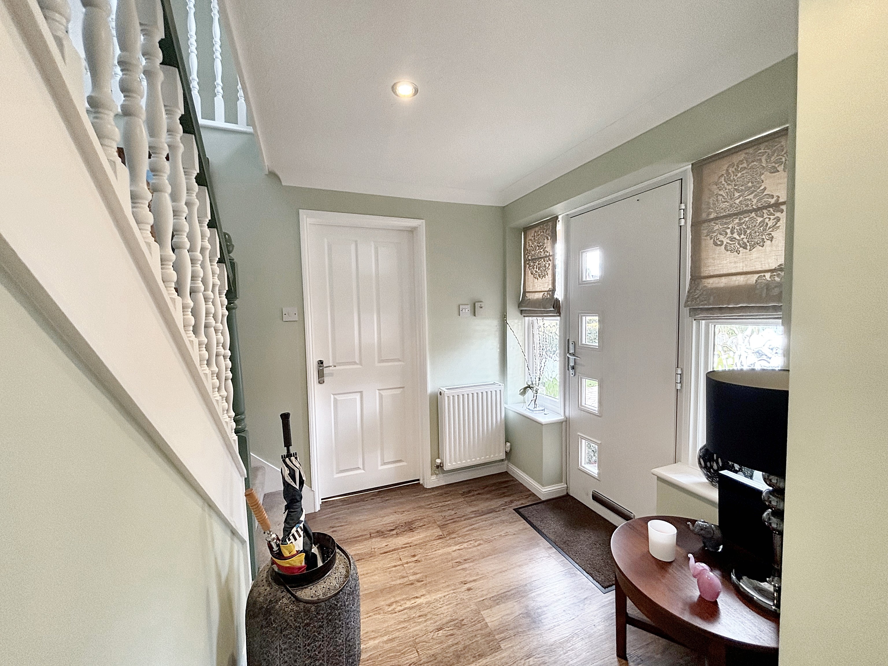 Oak timbered porch through the external door to the front elevation with a window to both sides. Spindle stairs leads to the first floor landing. Under stairs store. Inset spotlights. Internal doors lead through to: