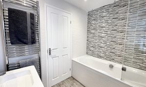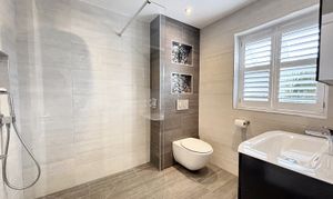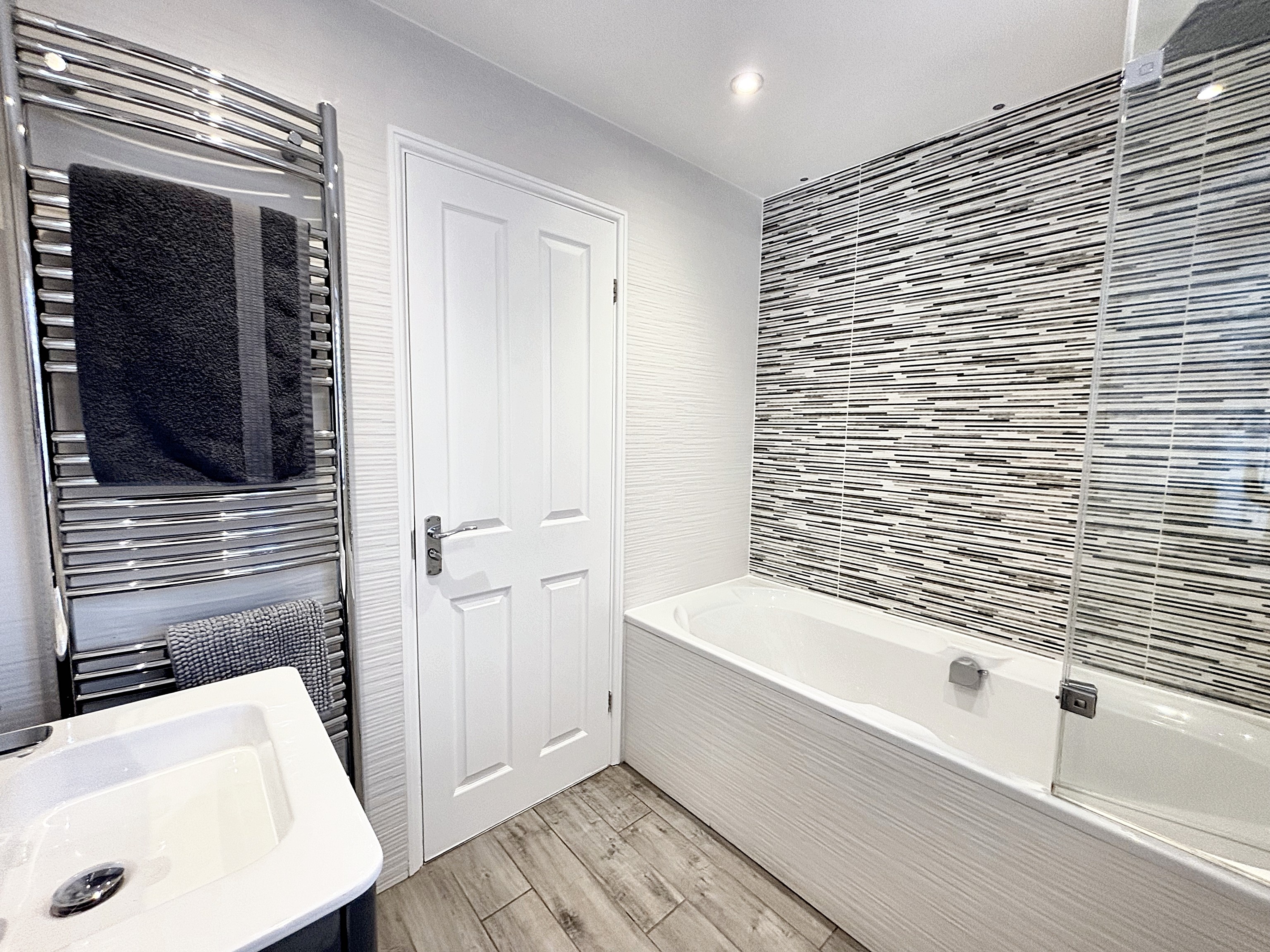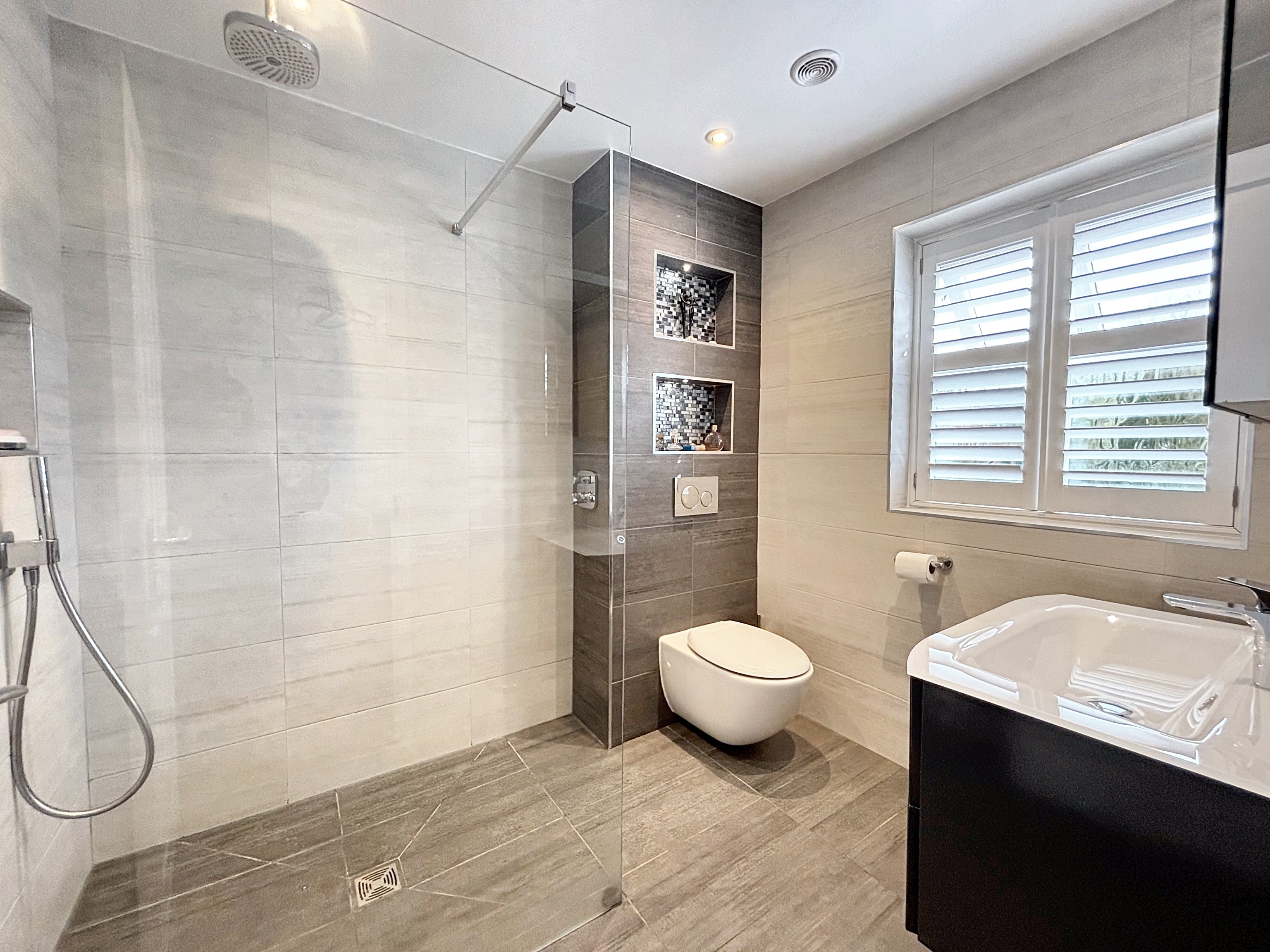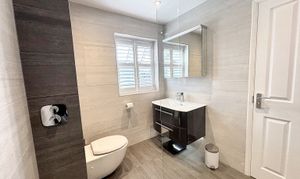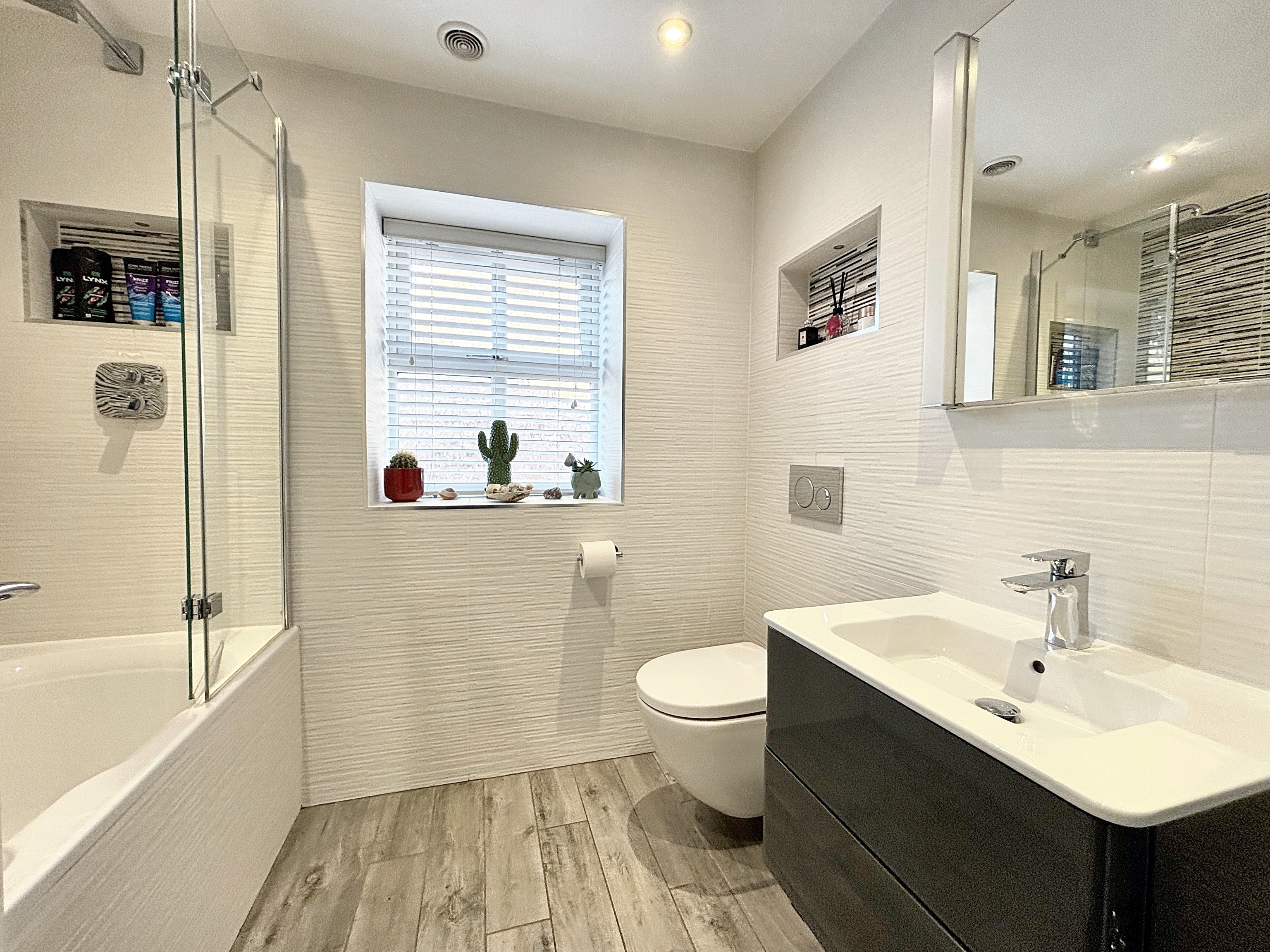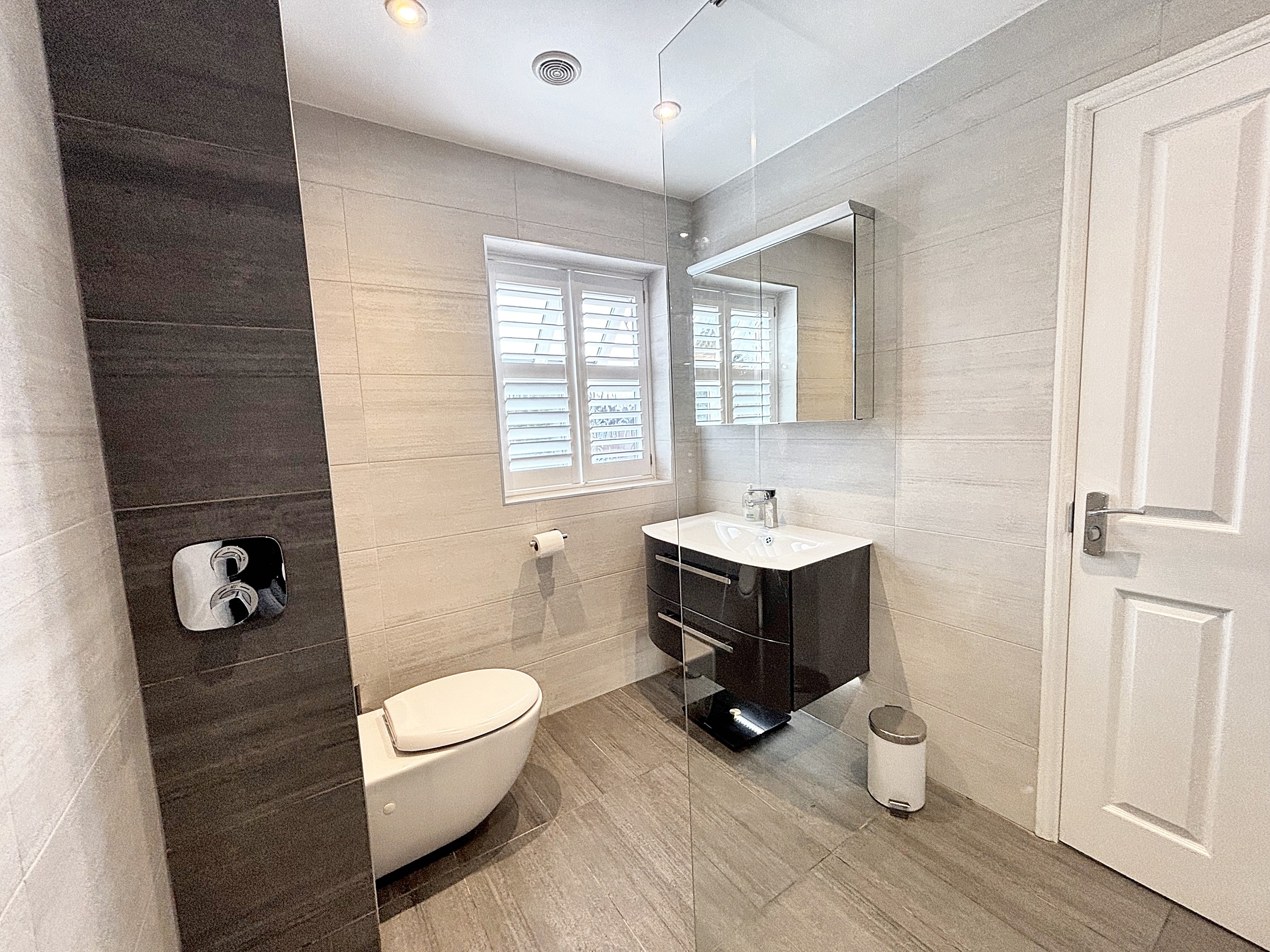 Window to the rear elevation with fitted planation shutters. Fully tiled walls and floor complete with under floor heating. Dual heated towel rail. Fitted with a low level W.C, vanity hand wash basin and a large walk in shower. Inset spotlights.