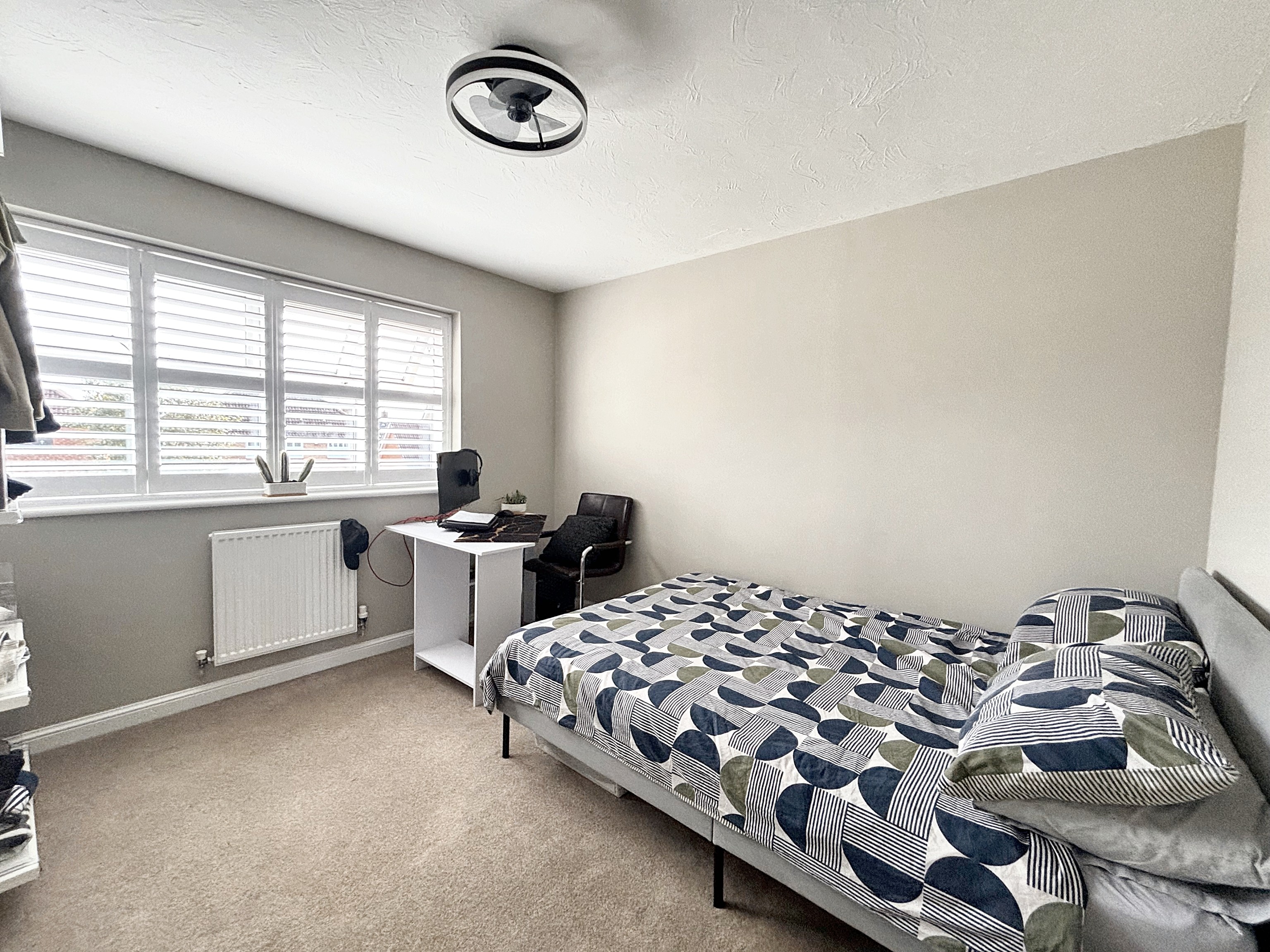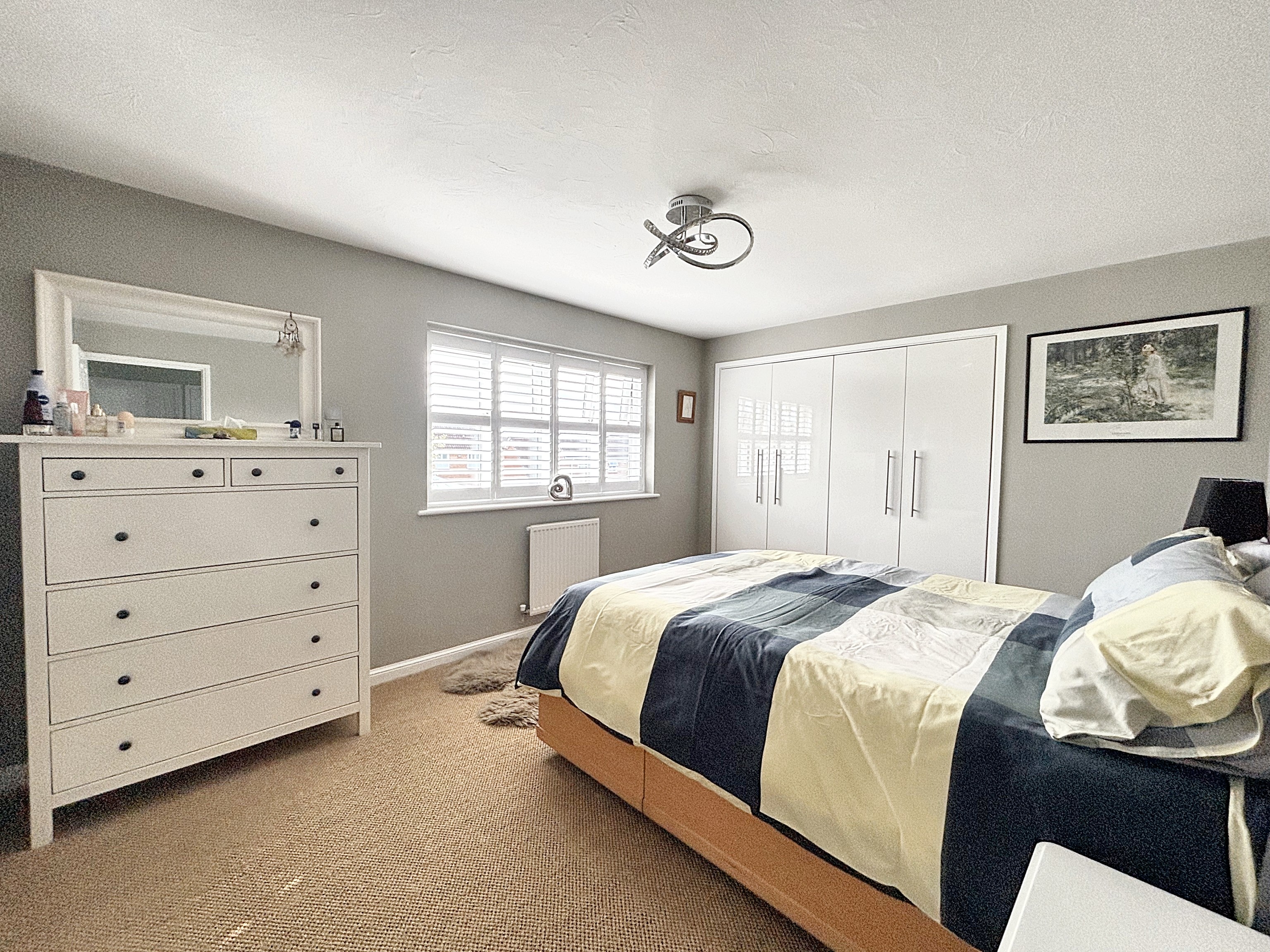 Window to the rear elevation complete with planation shutters. Fitted wardrobes to one wall. Internal door leads through to the en-suite.