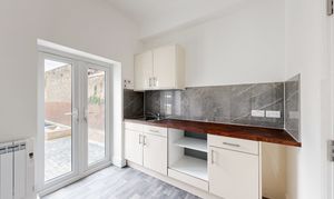 Newly installed kitchen comprising a rang of wall and base level units, single sink & drainer, new oven & hob. Dining space. French Doors opening out onto the rear garden. Electric heater. Door to: