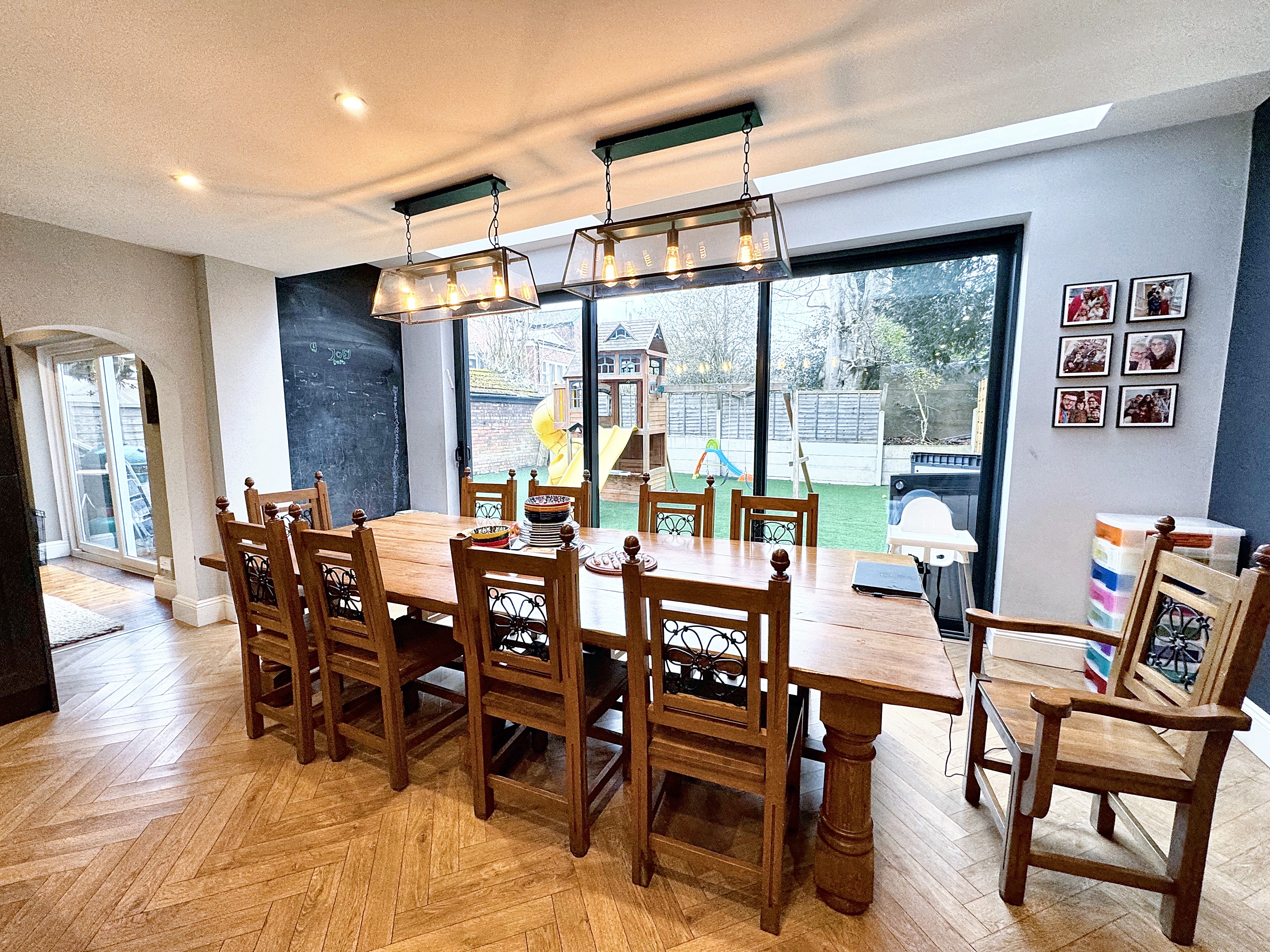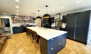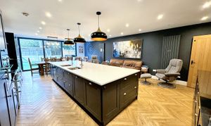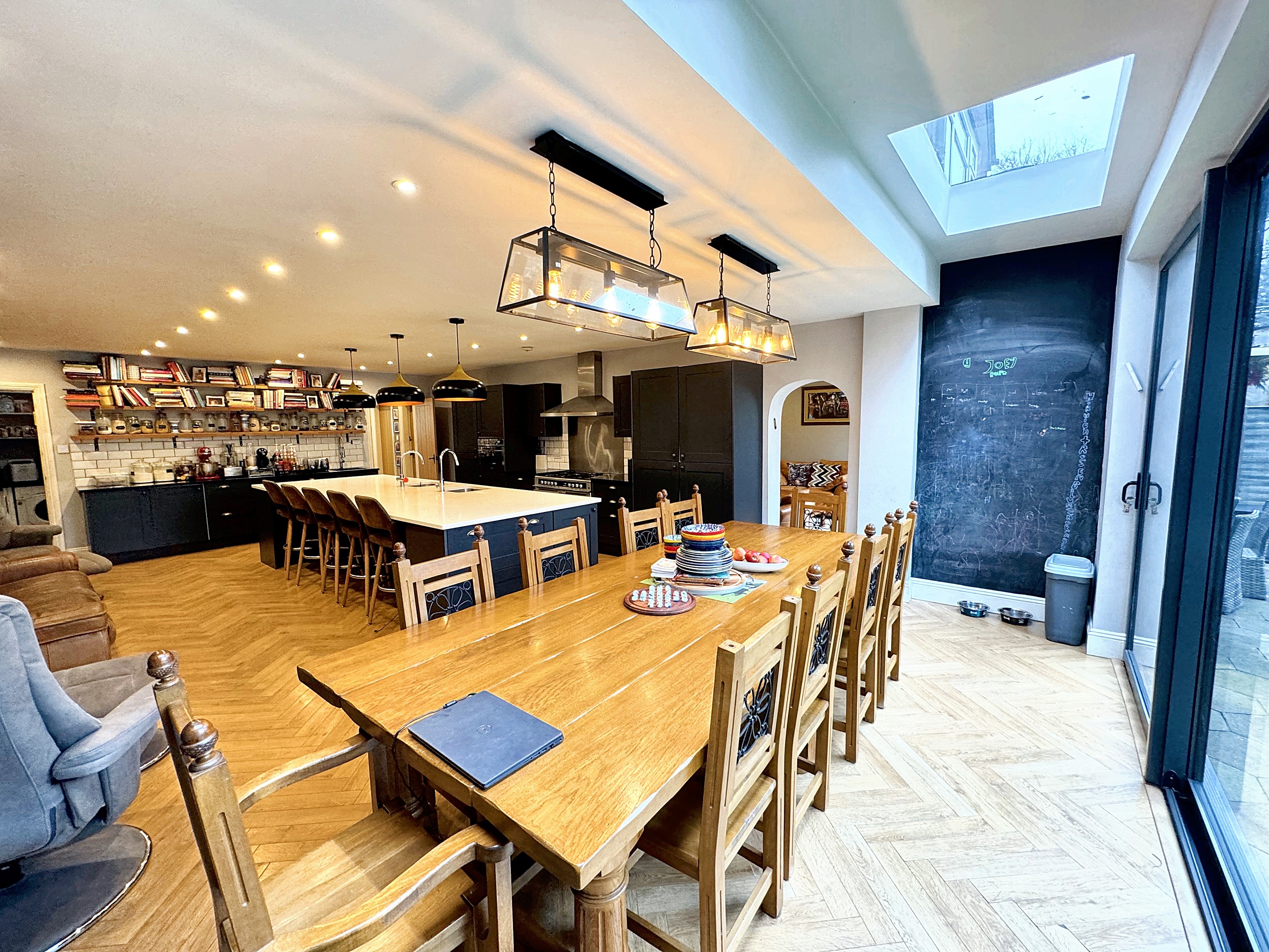 The heart of the home is the stunning modern family kitchen, centred around a large island and breakfast bar. This beautifully appointed space is ideal for both everyday living and entertaining, comfortably accommodating a full size dining table and enhanced by expansive bi fold doors that open directly onto the rear garden, allowing natural light to flood the room and creating a seamless indoor outdoor connection. A separate formal dining room provides a more intimate setting for entertaining, while the front lounge offers a calm and comfortable retreat. A dedicated home office and a downstairs WC complete the ground floor, adding further practicality and flexibility.