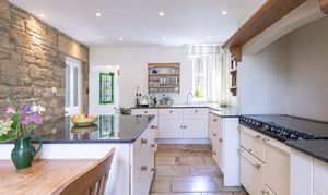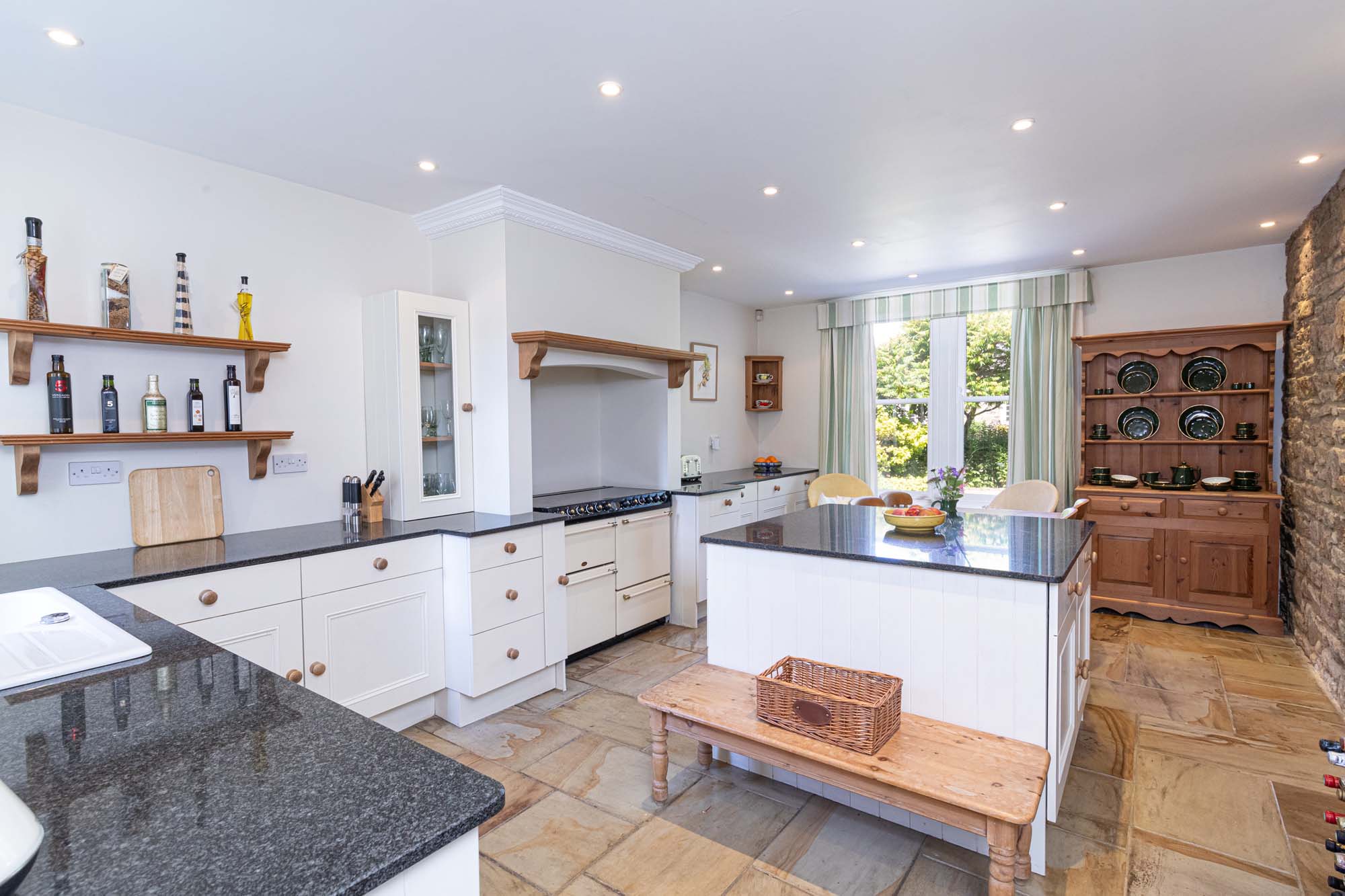 The kitchen is well-appointed, complete with granite worktops, a range of units including a Belling range cooker and a central island, offering ample space for casual dining. The kitchen's exposed stone wall adds a touch of rustic charm. The adjacent utility room, accessible via a delightful stained-glass door, provides additional storage and convenient access to the garden.
