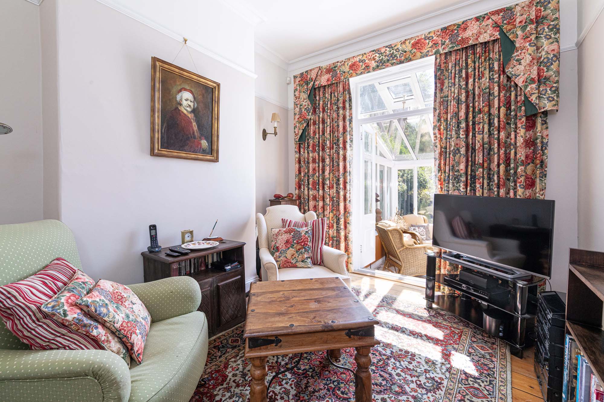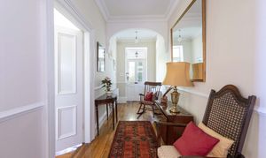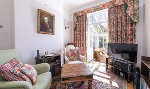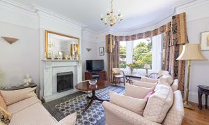 You are greeted by a welcoming vestibule that leads into a grand entrance hall featuring original wooden flooring. The property boasts three inviting reception rooms, each with period details such as large bay windows, ornate cornicing, and traditional fireplaces. These rooms are generously spacious and bathed in natural light. The main sitting room, at the front elevation, features an expansive bay window, wooden flooring, and an impressive marble fire surround.