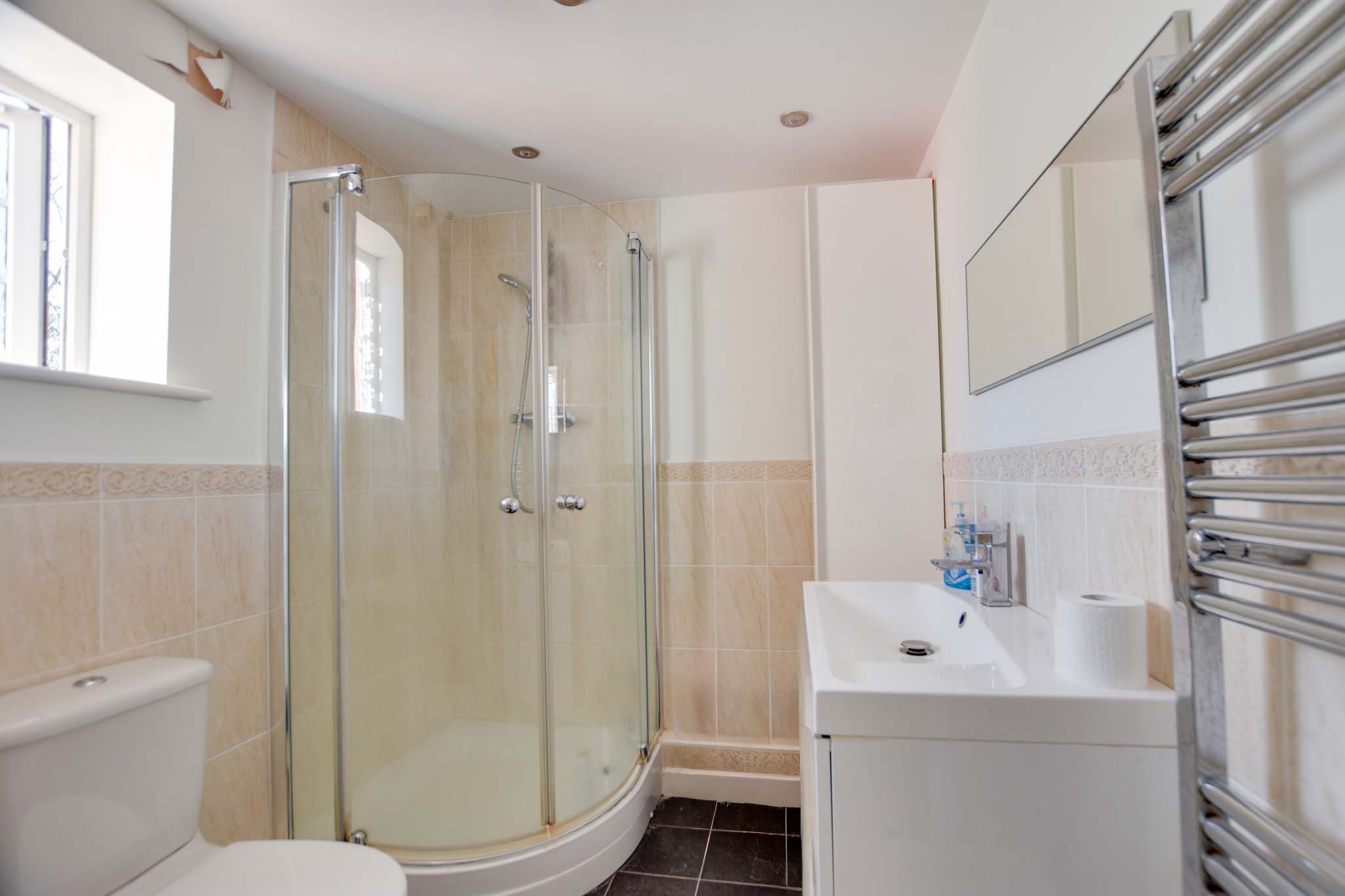 With a double-glazed window to the rear elevation, spotlights, a tiled shower cubicle, a wash hand basin, a low-level WC, tiled flooring, and a heated chrome towel rail.