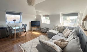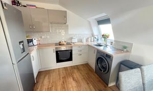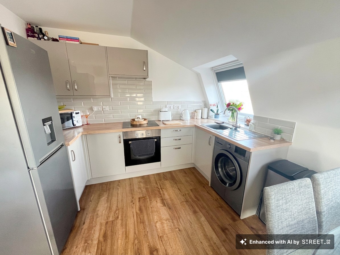 The accommodation includes a welcoming entrance hall with useful storage, leading into a spacious open‑plan living room and kitchen. Four Velux windows provide excellent natural light, while the kitchen is fitted with modern units, wood‑effect worktops, tiled splashbacks and integrated appliances. The double bedroom offers comfortable proportions, and the stylish shower room features a double‑width enclosure, contemporary fittings and a heated towel radiator.