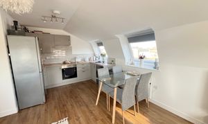 A bright and spacious open‑plan living area featuring four Velux windows—two to the side and two to the rear—filling the room with natural light. The kitchen is fitted with a contemporary range of matching wall and base units, wood‑effect laminate worktops, tiled splashbacks, and a stainless‑steel sink with mixer tap. Integrated appliances include an electric oven, hob, and extractor hood. Finished with an electric radiator and ample space for both living and dining furniture.