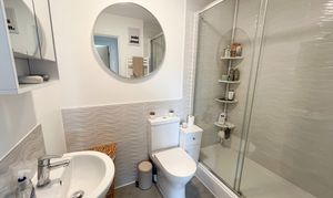 A stylish, modern shower room fitted with a double‑width shower and glass screen, low‑level WC, and wash hand basin. Finished with tiled splashbacks and a heated towel radiator, creating a clean and contemporary feel.