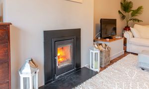 Light-filled open-plan space with feature log burner and patio doors opening to the rear garden.