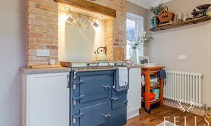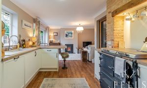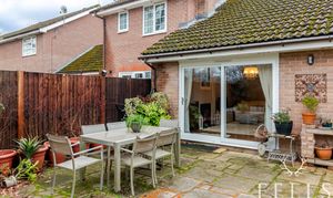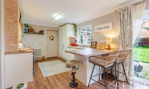 The heart of the home is the light-filled L-shaped open-plan kitchen, dining and living area, creating an inviting space for both everyday living and entertaining. The cosy living area features a charming log burner as a focal point and enjoys views over the rear garden, with sliding patio doors opening directly onto the patio to enhance indoor-outdoor living.