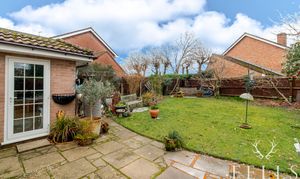 Outside, the property is approached via a tarmac driveway offering off-road parking for multiple vehicles and access to the single garage with power and lighting. The front garden is mainly laid to lawn, while the private rear garden is a particular highlight, featuring a sunny patio seating area, mature shrubs, established planting and a good degree of privacy. Side access further enhances practicality.