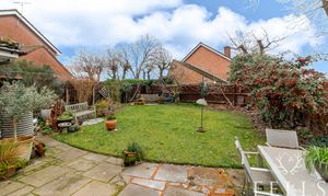 Large garden with a sunny patio adjacent to the living room. Mature borders surround a central lawn.