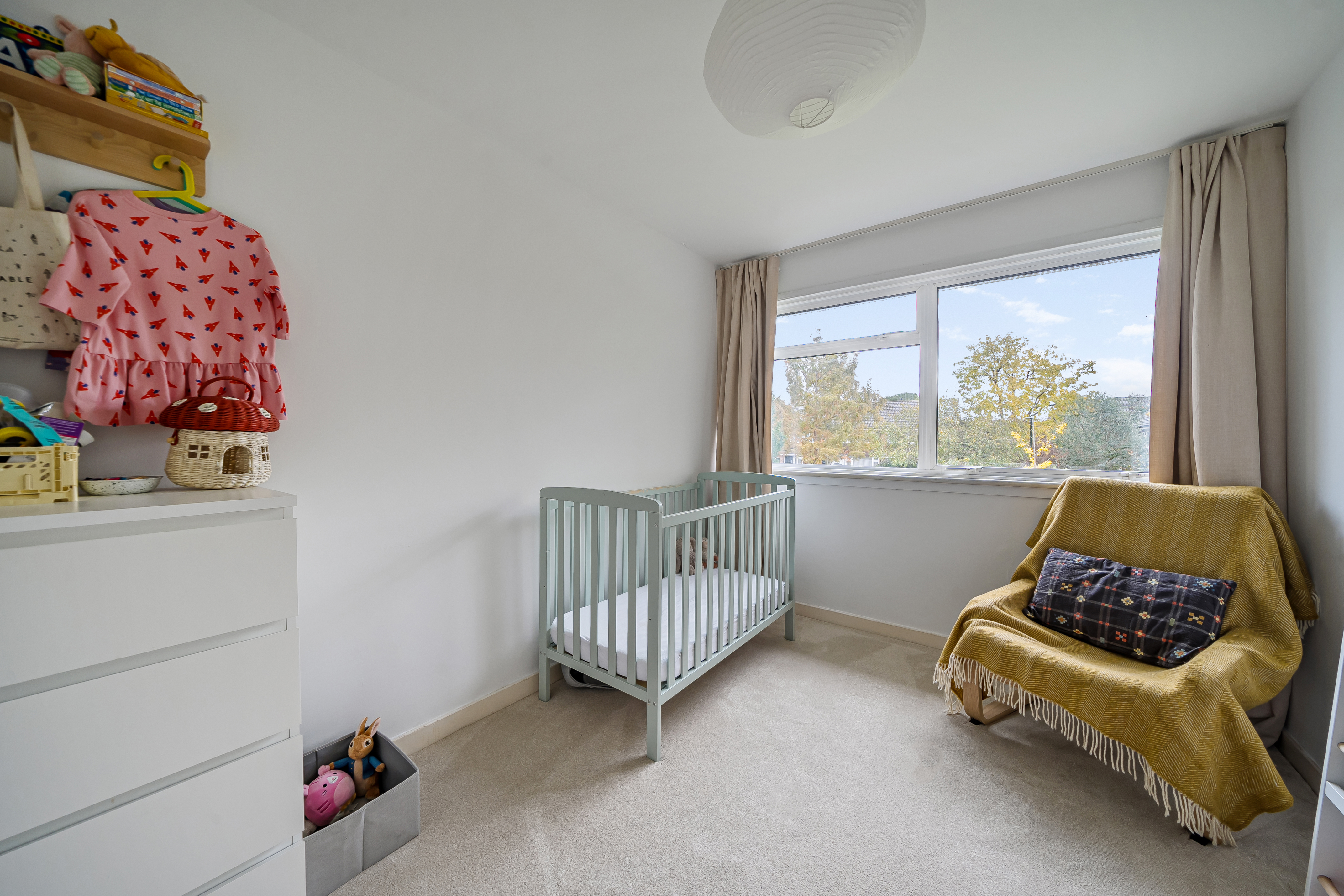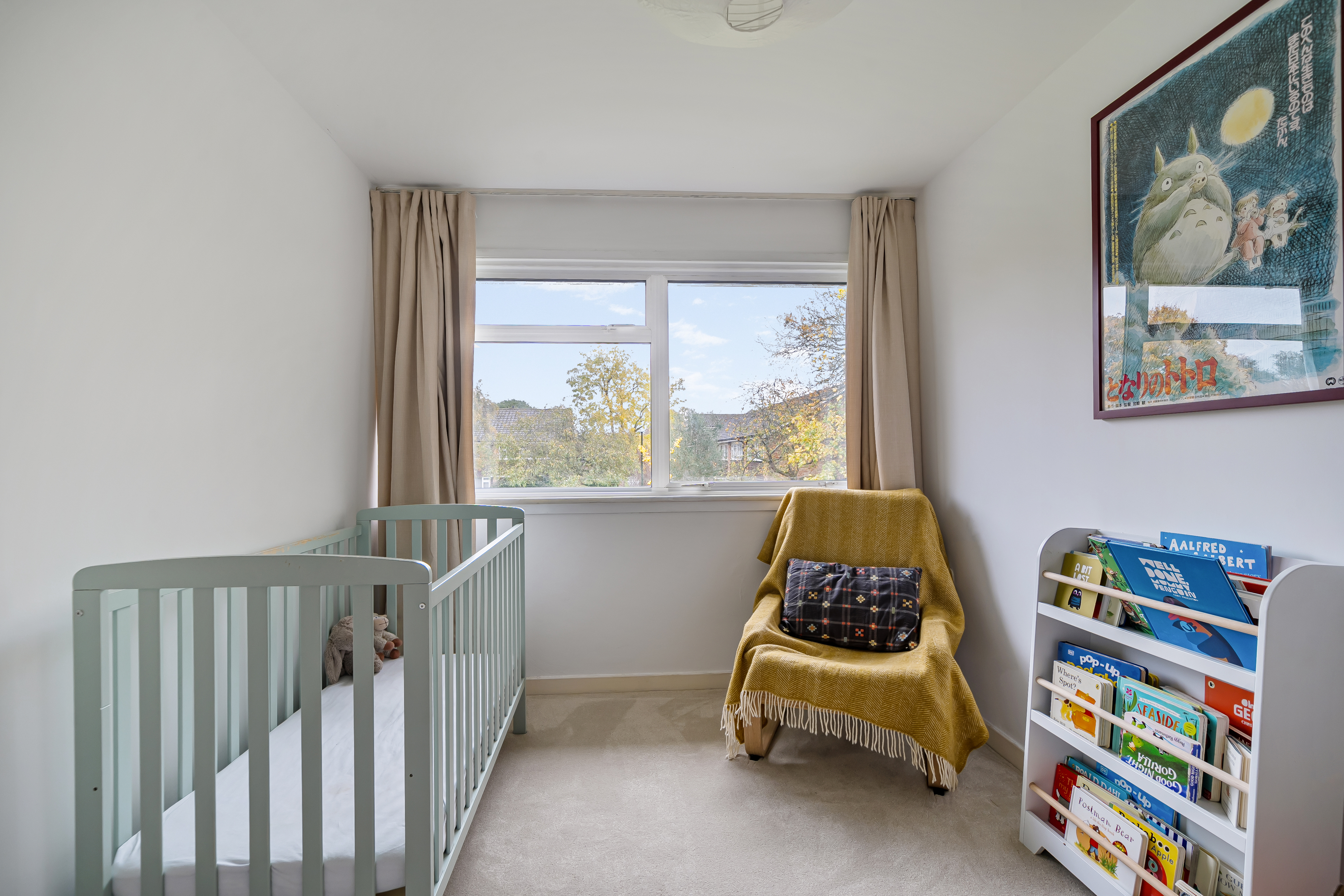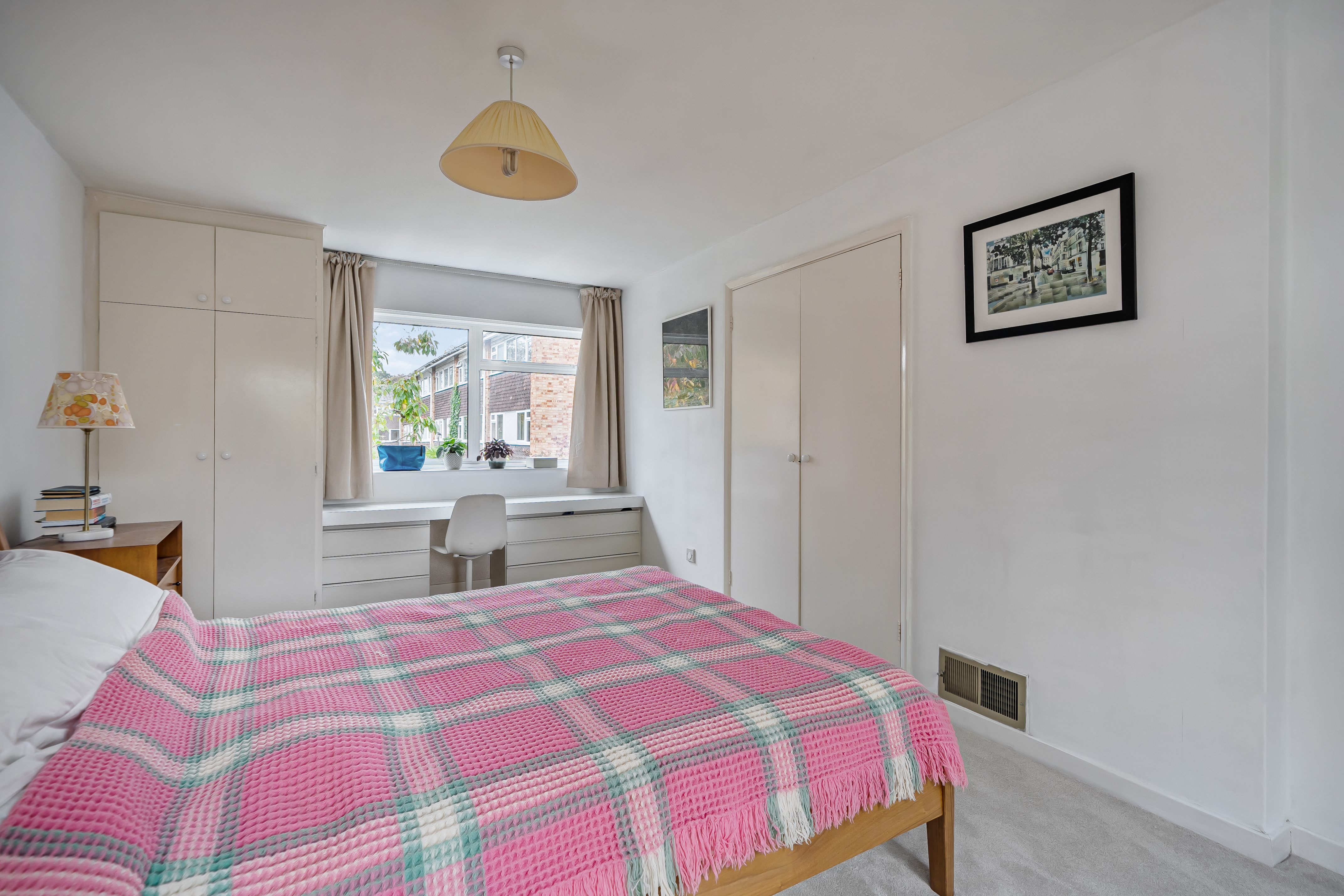 Upstairs, the principal bedroom (18’3 x 10’8) is double aspect with built-in wardrobes, accompanied by two further double bedrooms. The newly refitted bathroom features contemporary fixtures, vanity storage, and a walk-in shower.