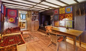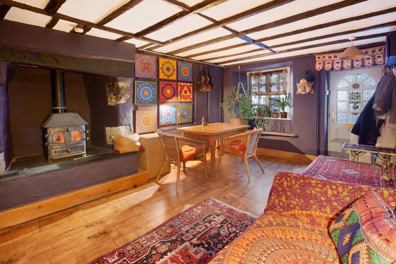Crossing the threshold, you are welcomed into a warm and inviting living room, lovingly styled to complement the character and age of the property. To the right, a raised inglenook fireplace forms a striking focal point and is home to a recently installed log burner, perfect for cosy evenings. Exposed cob and stone walls add to the cottage’s charm. High ceilings throughout create a surprisingly bright and airy feel, particularly impressive for a cottage of this period.