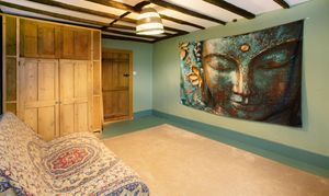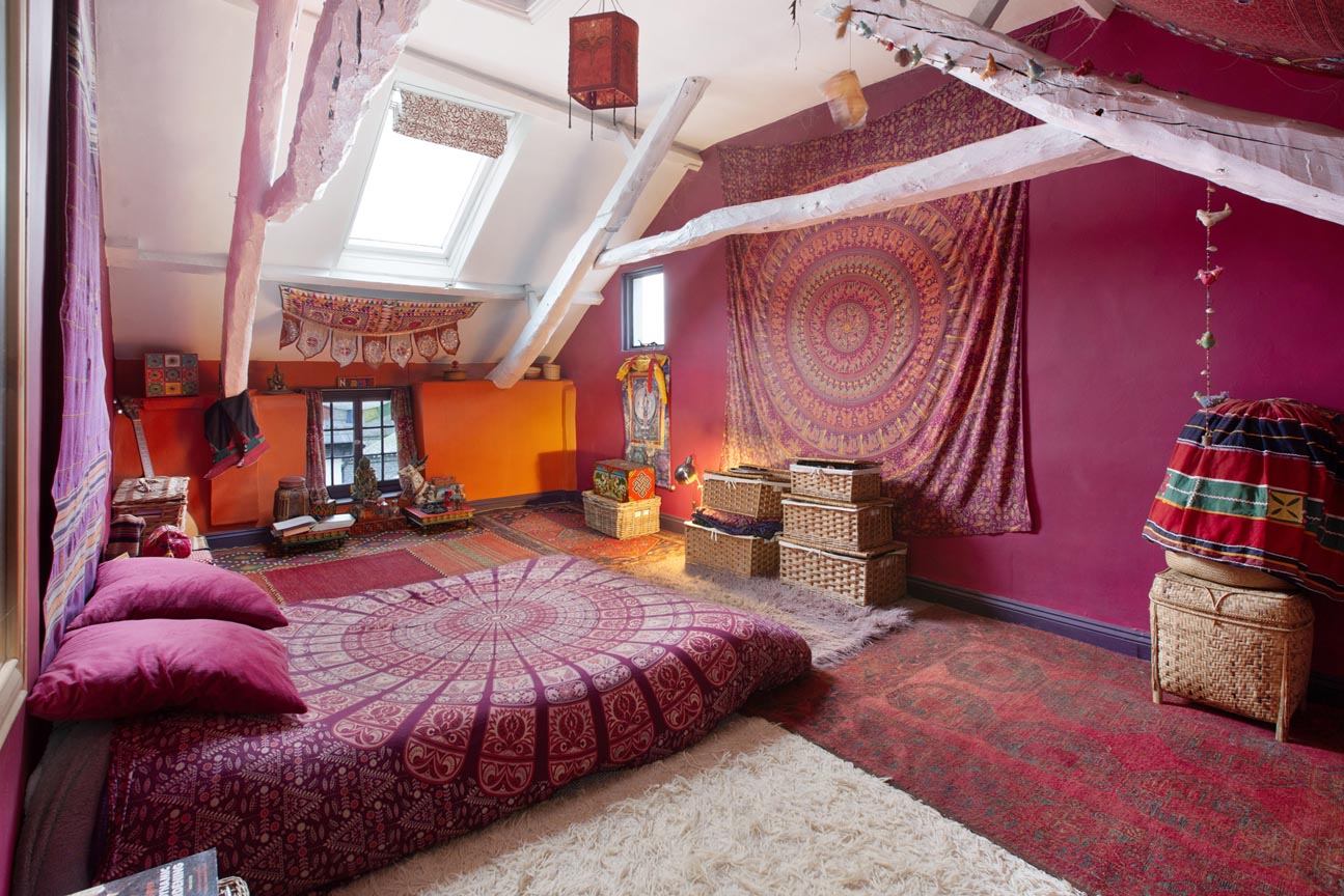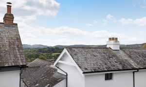 A second staircase leads to the principal bedroom, an exceptional space with full-height ceilings and exposed beams. Natural light floods in through a Velux window, while a low-level window perfectly frames views over the rooftops of East Street and out towards Haytor. This is a home with true artistic spirit, full of individuality and character.