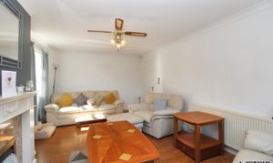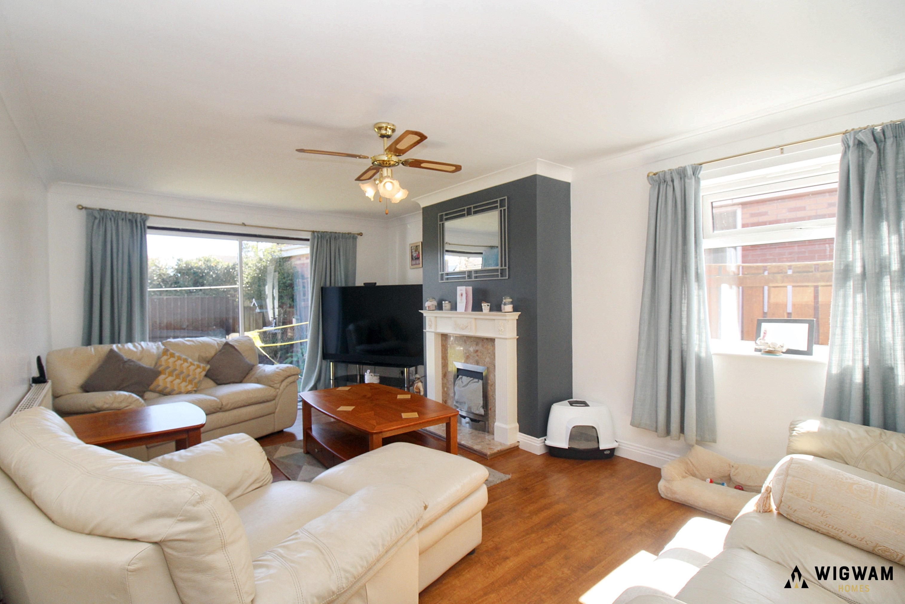 With laminate flooring, radiator, feature fireplace, double glazed windows, ceiling fan and sliding doors leading to rear garden.
