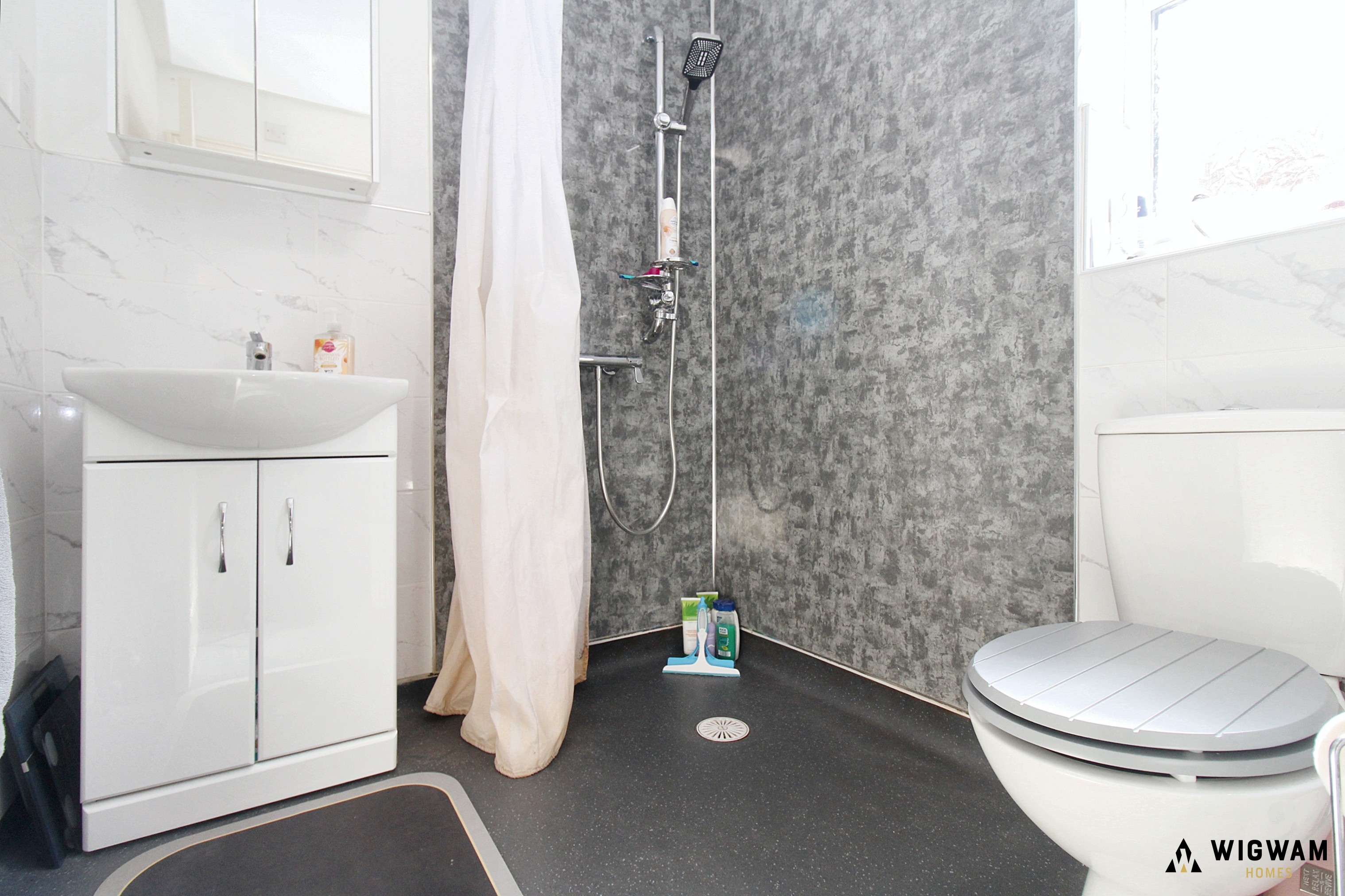With vinyl flooring, towel radiator, vanity hand wash basin, shower attachment, WC and double glazed windows.