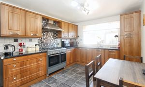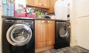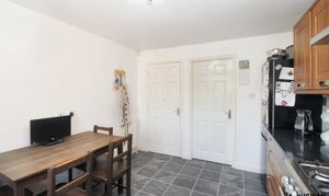 With vinyl flooring, radiator, double glazed windows, cabinets, integrated fridge, laminate worksurfaces, sink/drainer, space for appliances, fan extractor and door leading to utility room.