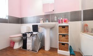 With laminate flooring, radiator, WC, double glazed windows, pedestal hand wash basin and bath tub with shower attachment.