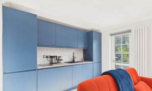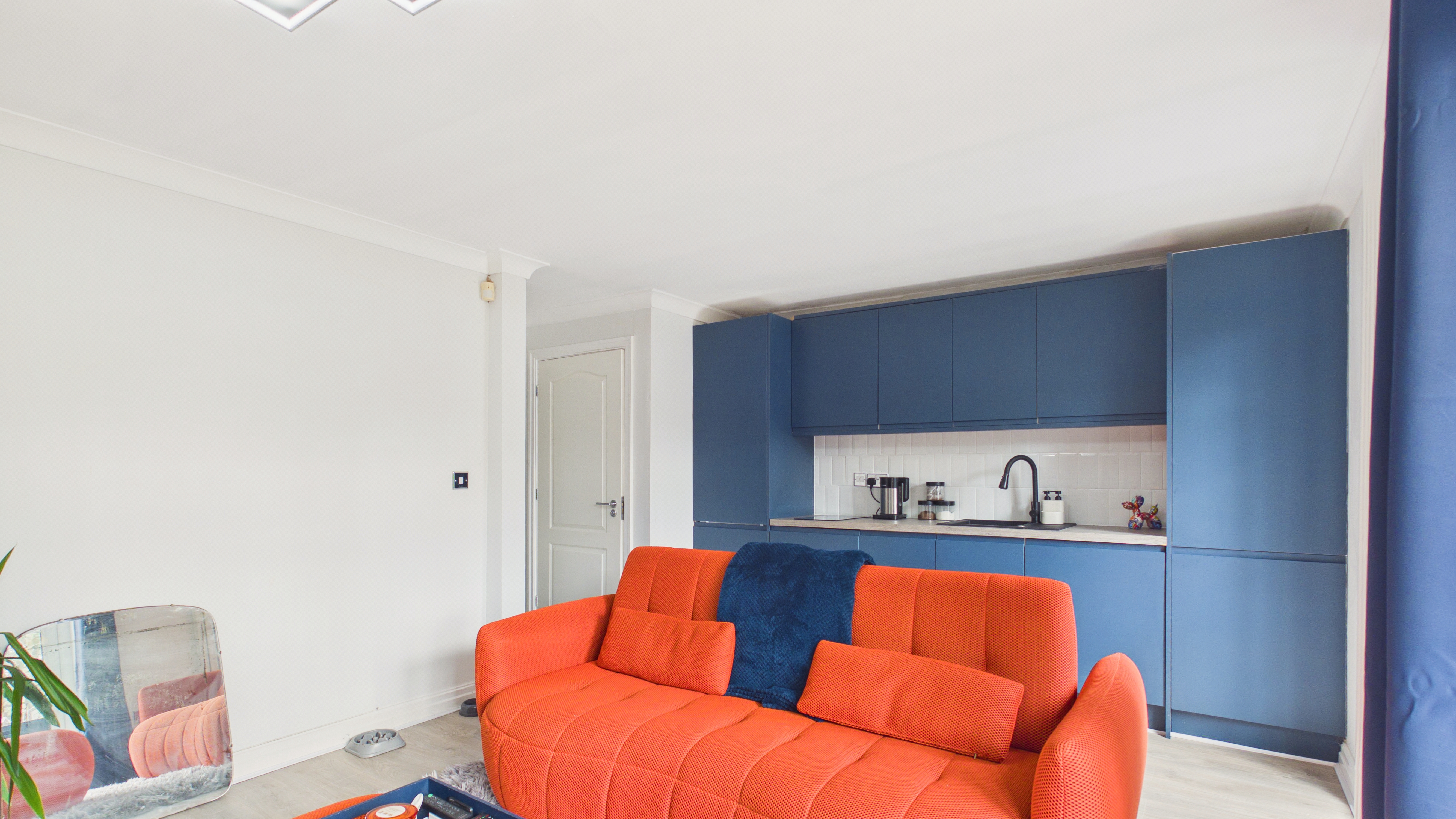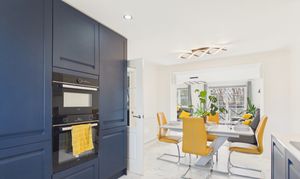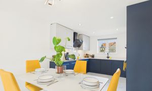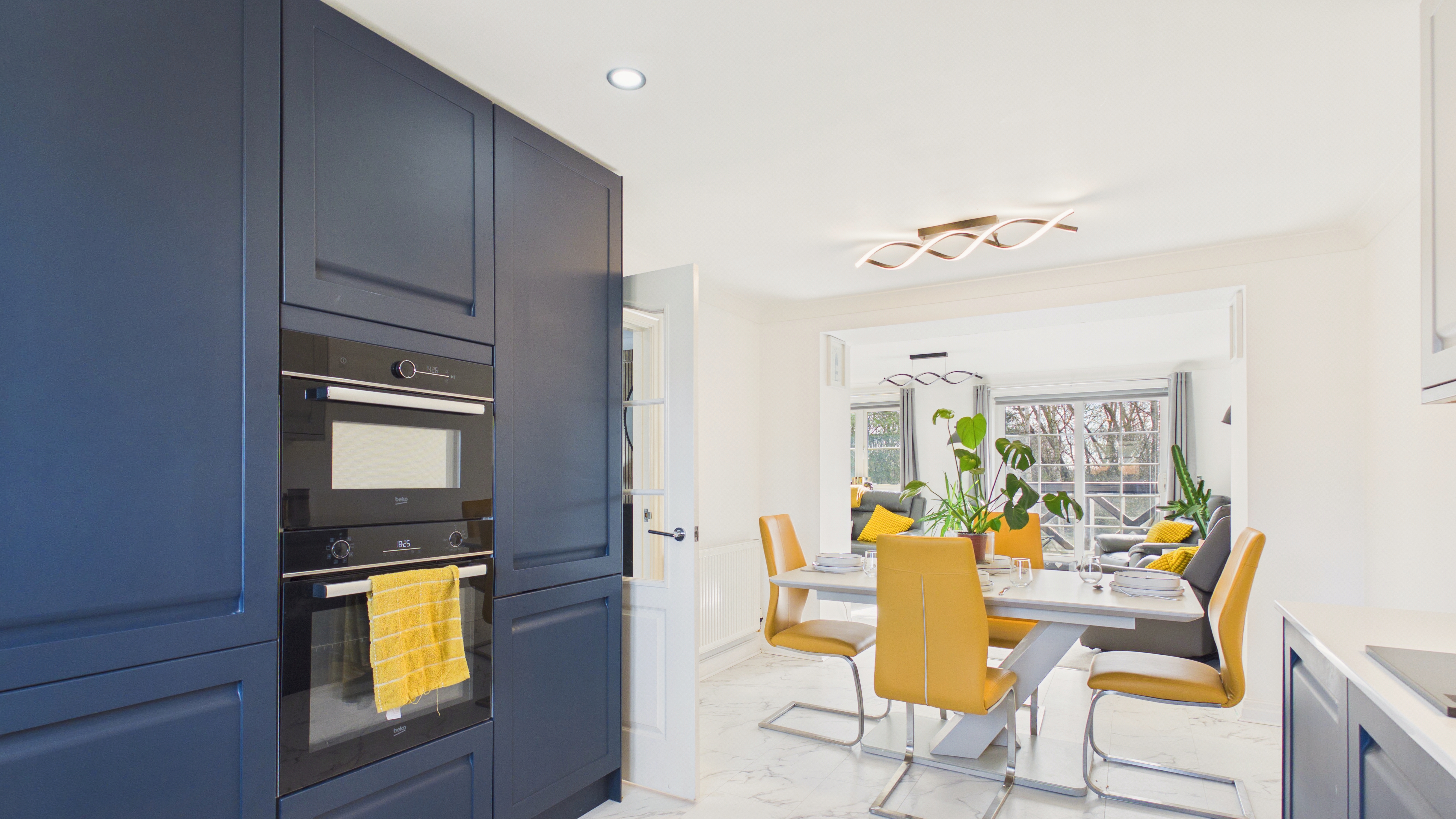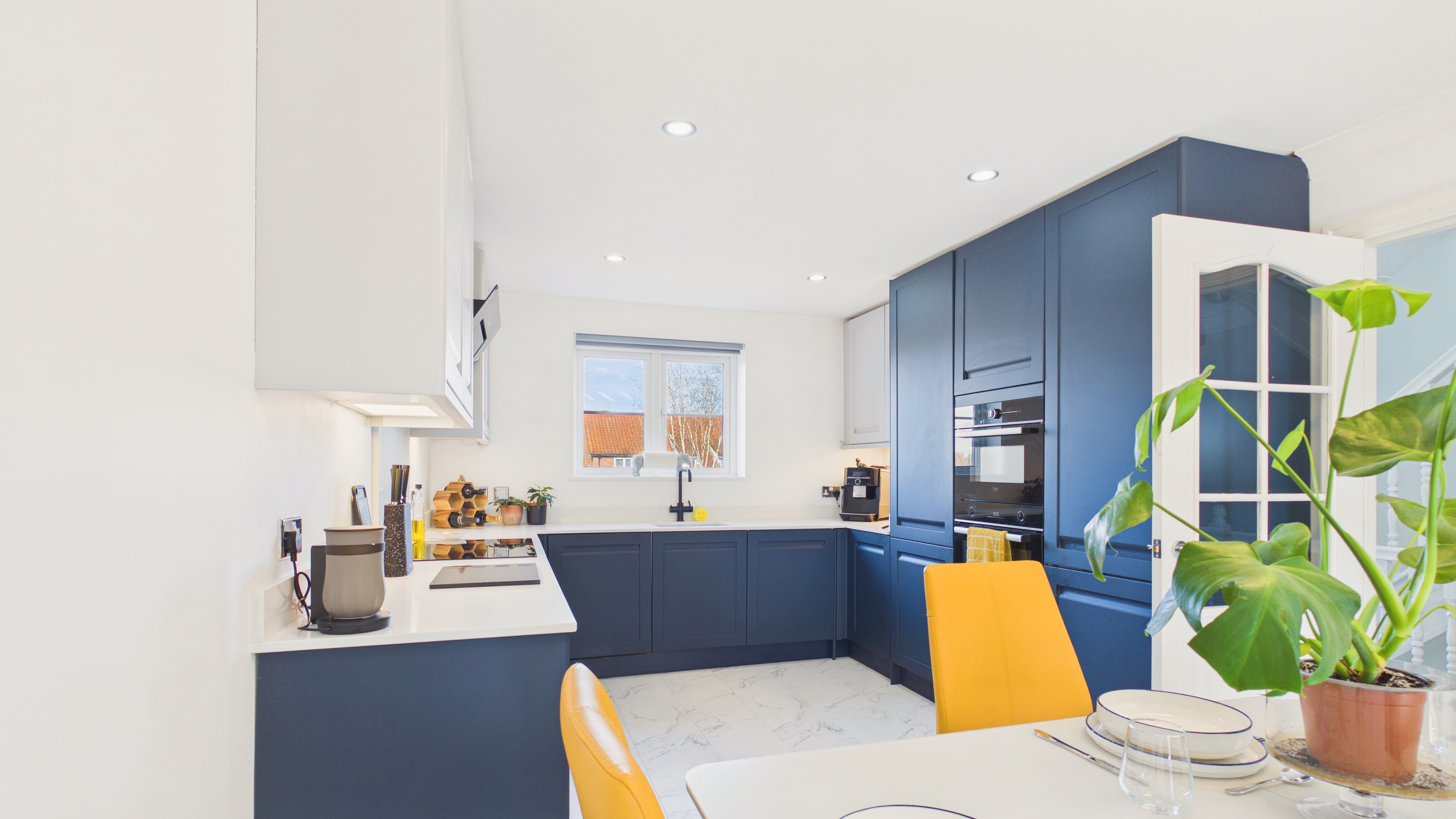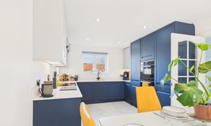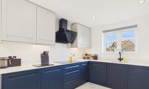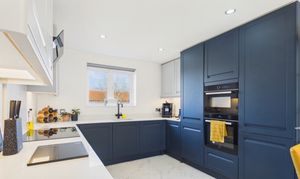 - Premium kitchen finish: Quartz worktops/backsplash, instant boiling water tap, integrated appliances, built-in bins and integrated larder