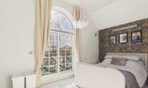 The second floor provides three bedrooms: two doubles and a single currently used as an office, along with the main bathroom—a four-piece suite with separate bath, shower, basin and WC. The principal bedroom is a true highlight, featuring vaulted ceilings, built-in wardrobes, a sleek three-piece ensuite, and a large private balcony overlooking the woodland and rear garden—an ideal spot for a morning coffee.